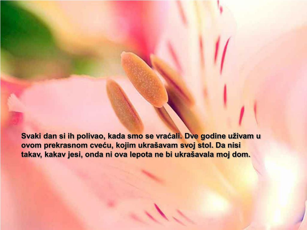 Svaki dan si ih polivao, kada smo se vraćali. Dve godine uživam u ovom prekrasnom cveću, kojim ukrašavam svoj stol. Da nisi takav, kakav jesi, onda ni ova lepota ne bi ukrašavala moj dom.