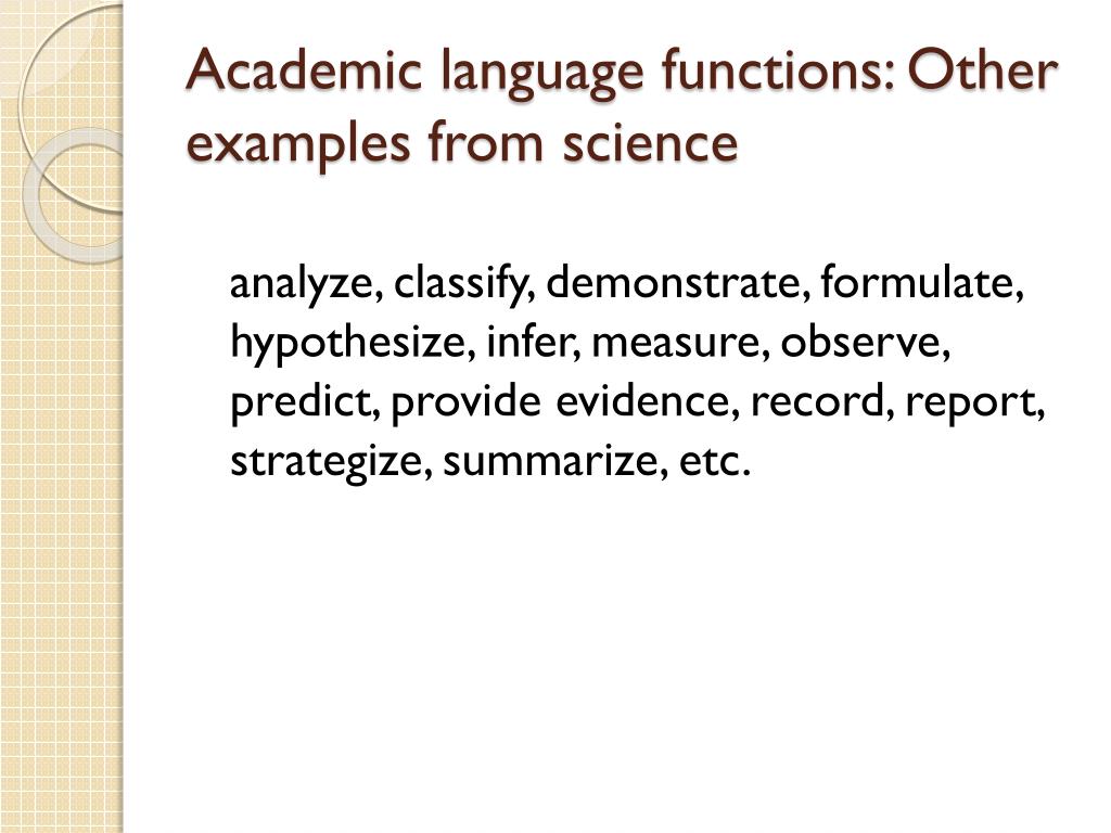 Academic language functions: Other examples from science analyze, classify, demonstrate, formulate, hypothesize, infer, measure, observe, predict, provide evidence, record, report, strategize, summarize, etc.