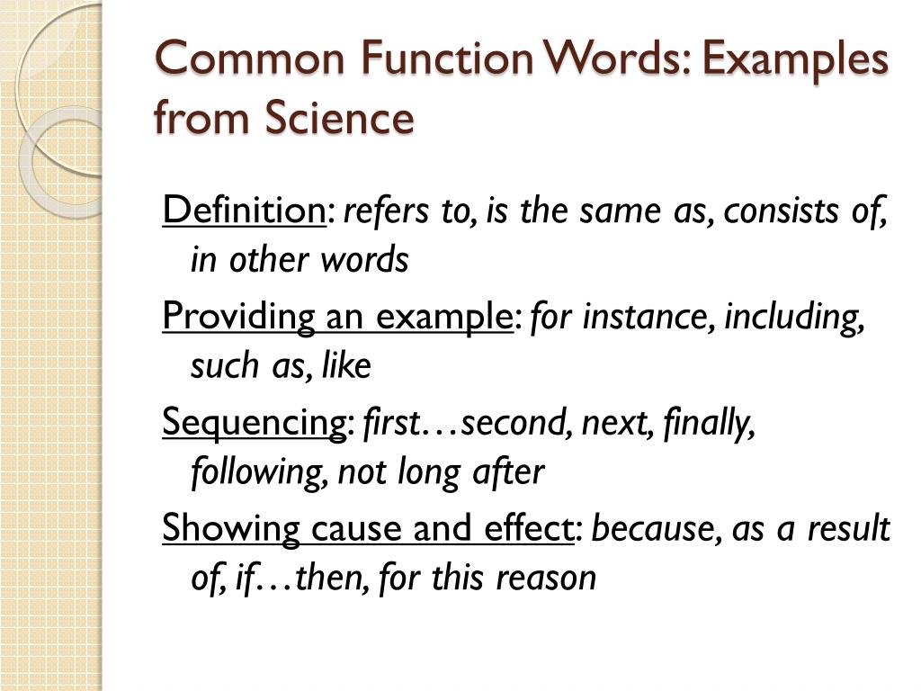 Common Function Words: Examples from Science Definition: refers to, is the same as, consists of, in other words Providing an example: for instance, including, such as, like Sequencing: first…second, next, finally, following, not long after Showing cause and effect: because, as a result of, if…then, for this reason