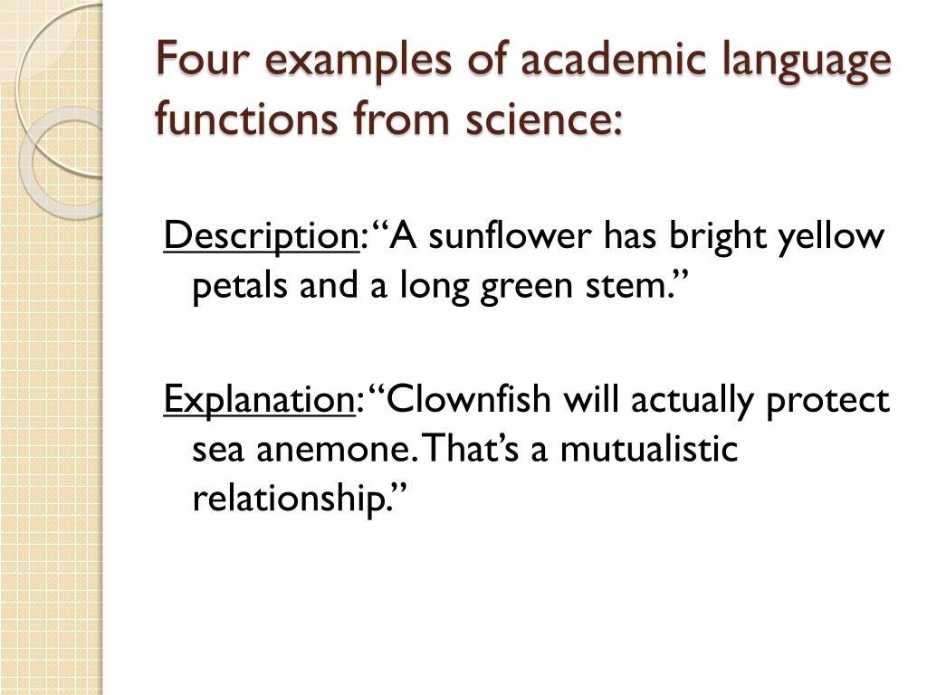 Four examples of academic language functions from science: Description: “A sunflower has bright yellow petals and a long green stem.” Explanation: “Clownfish will actually protect sea anemone. That’s a mutualistic relationship.”