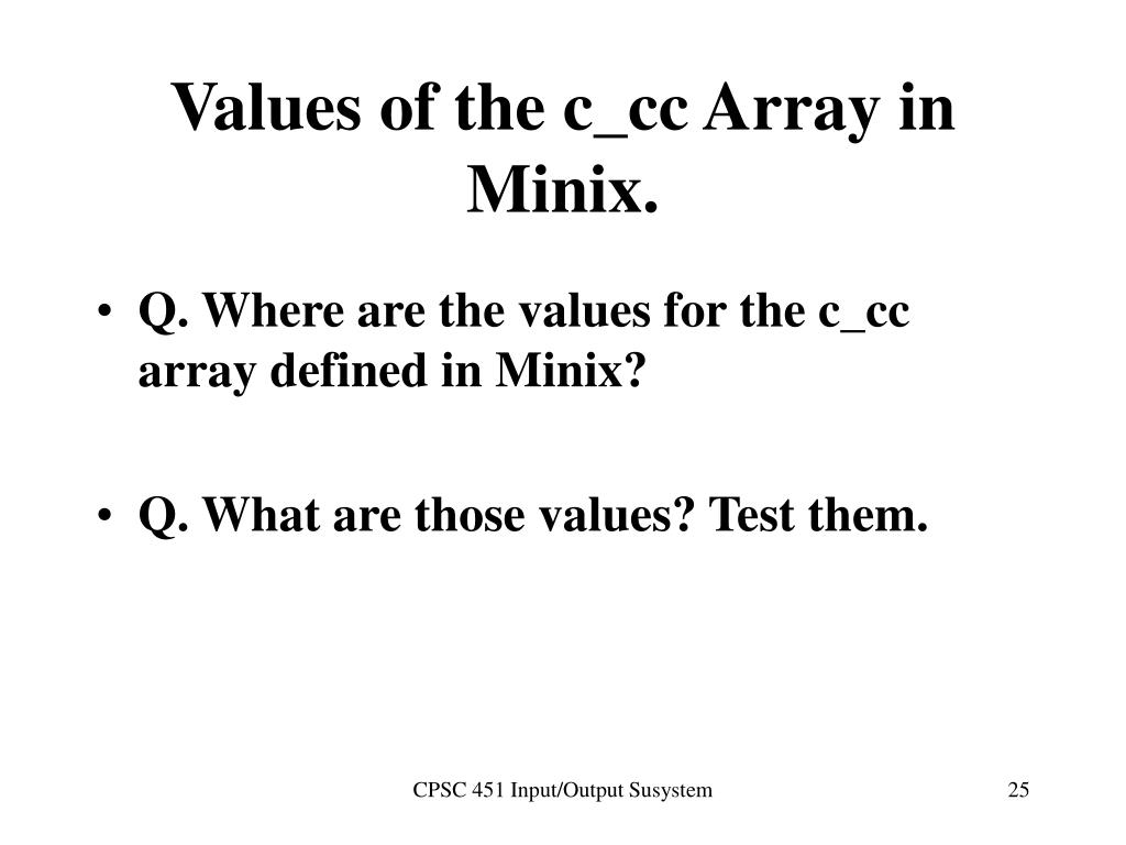 Values of the c_cc Array in Minix. • Q. Where are the values for the c_cc array defined in Minix? • Q. What are those values? Test them. CPSC 451 Input/Output Susystem