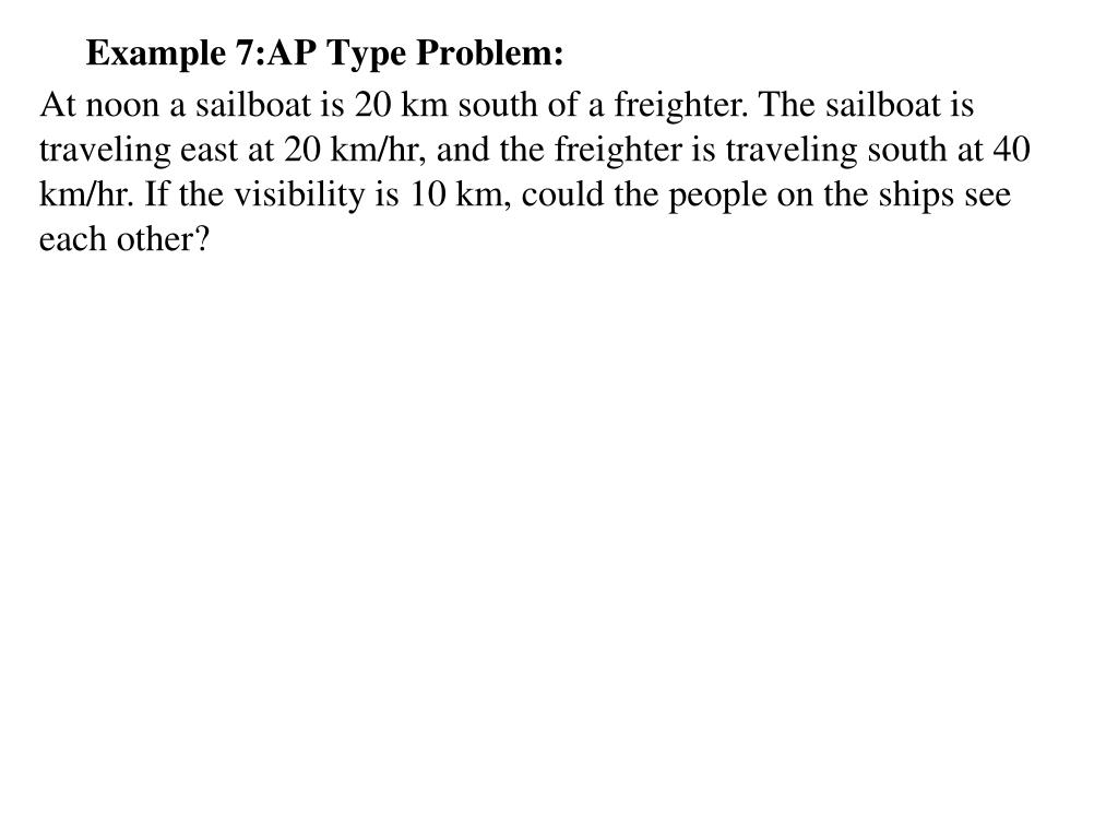 Example 7:AP Type Problem: At noon a sailboat is 20 km south of a freighter. The sailboat is traveling east at 20 km/hr, and the freighter is traveling south at 40 km/hr. If the visibility is 10 km, could the people on the ships see each other?