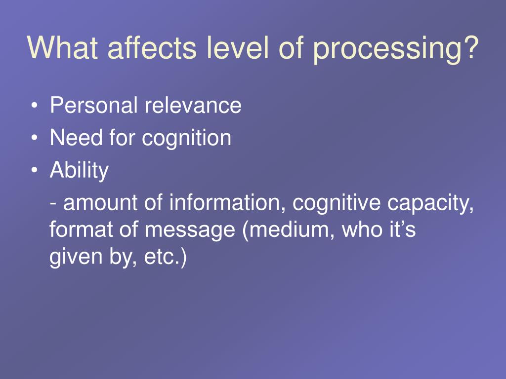 What affects level of processing? • Personal relevance • Need for cognition • Ability - amount of information, cognitive capacity, format of message (medium, who it’s given by, etc.)