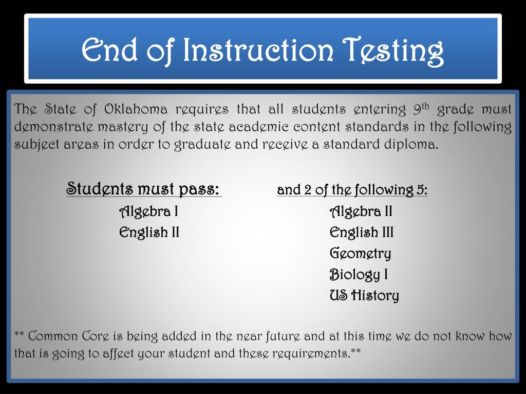 End of Instruction Testing The State of Oklahoma requires that all students entering 9th grade must demonstrate mastery of the state academic content standards in the following subject areas in order to graduate and receive a standard diploma. Students must pass:and 2 of the following 5: Algebra I Algebra II English II English III Geometry Biology I US History ** Common Core is being added in the near future and at this time we do not know how that is going to affect your student and these requirements.**