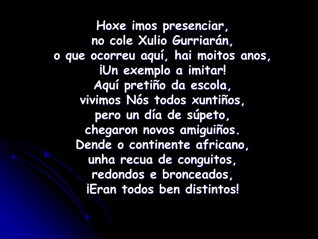 Hoxe imos presenciar, no cole Xulio Gurriarán, o que ocorreu aquí, hai moitos anos, ¡Un exemplo a imitar! Aquí pretiño da escola, vivimos Nós todos xuntiños, pero un día de súpeto, chegaron novos amiguiños. Dende o continente africano, unha recua de conguitos, redondos e bronceados, ¡Eran todos ben distintos!