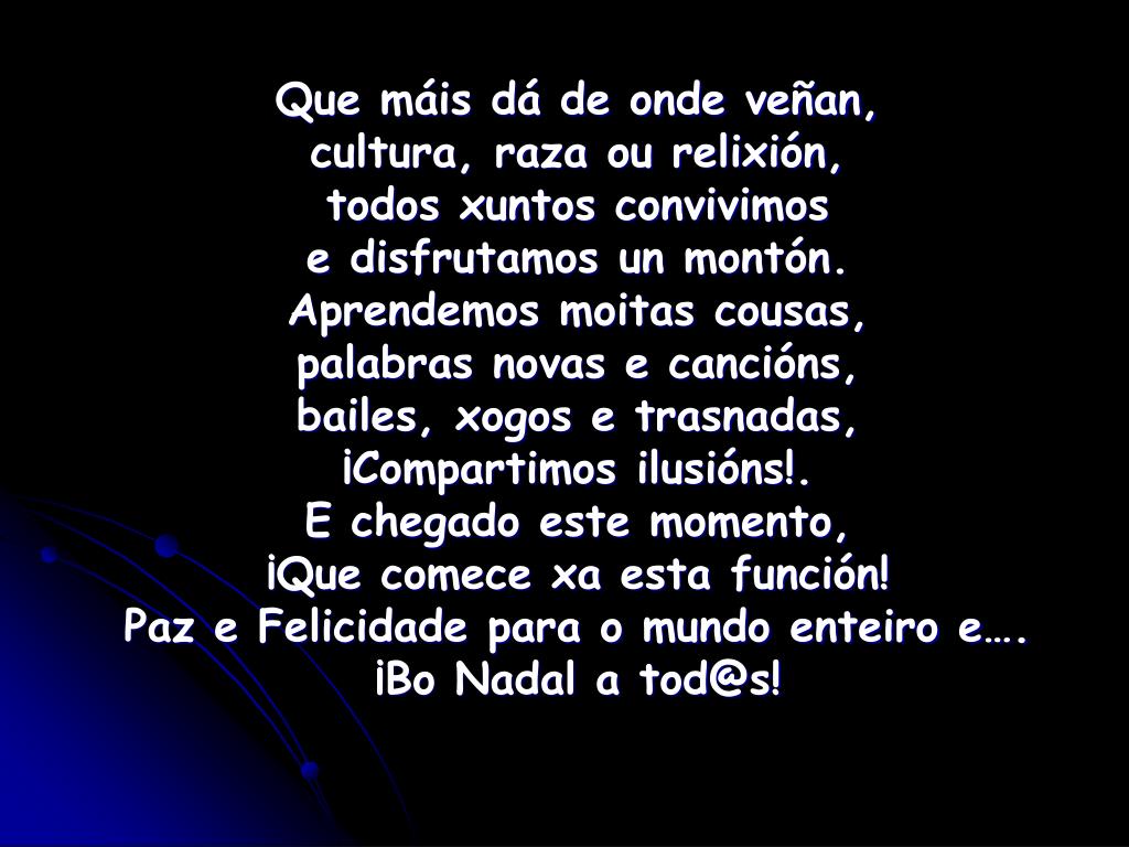 Que máis dá de onde veñan, cultura, raza ou relixión, todos xuntos convivimos e disfrutamos un montón. Aprendemos moitas cousas, palabras novas e cancións, bailes, xogos e trasnadas, ¡Compartimos ilusións!. E chegado este momento, ¡Que comece xa esta función! Paz e Felicidade para o mundo enteiro e…. ¡Bo Nadal a tod@s!