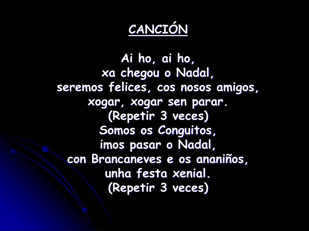 CANCIÓN Ai ho, ai ho, xa chegou o Nadal, seremos felices, cos nosos amigos, xogar, xogar sen parar. (Repetir 3 veces) Somos os Conguitos, imos pasar o Nadal, con Brancaneves e os ananiños, unha festa xenial. (Repetir 3 veces)