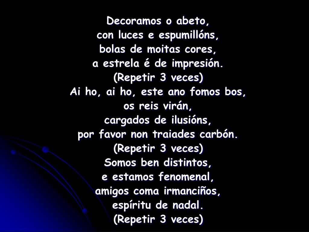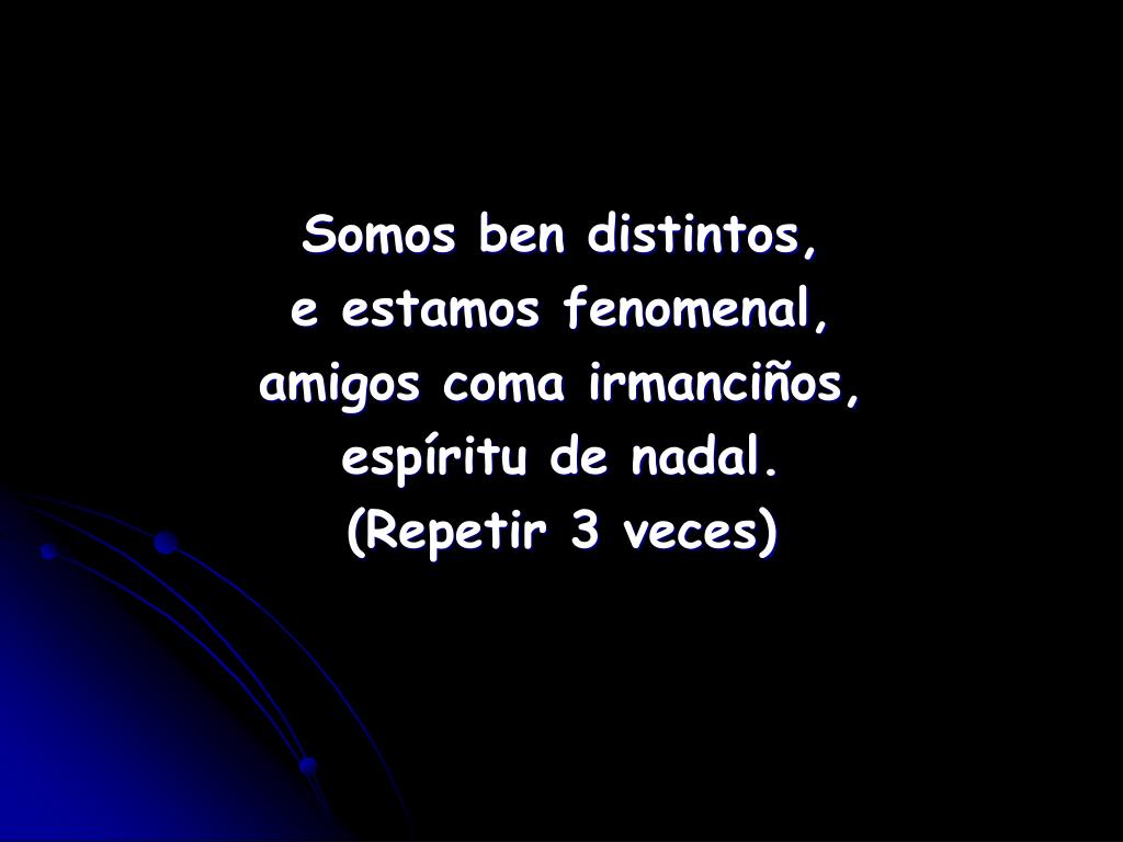 Somos ben distintos, e estamos fenomenal, amigos coma irmanciños, espíritu de nadal. (Repetir 3 veces)
