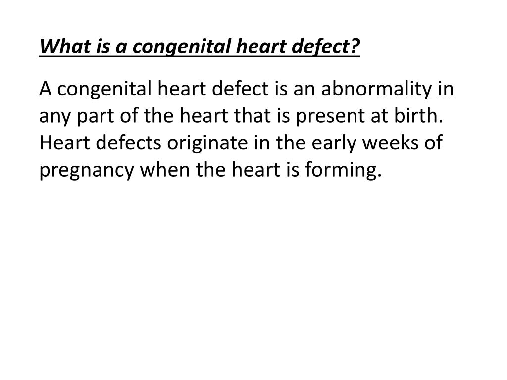 Congenital Cardiac D efects. o f the neonate. What is a congenital heart defect? A congenital heart defect is an abnormality in any part of the heart that is present at birth. Heart defects originate in the early weeks of pregnancy when the heart is forming. .