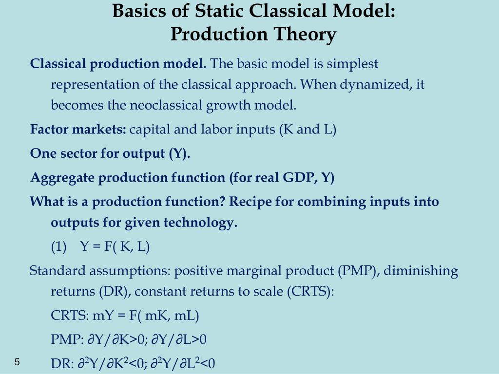 Basics of Static Classical Model: Production Theory Classical production model. The basic model is simplest representation of the classical approach. When dynamized, it becomes the neoclassical growth model. Factor markets: capital and labor inputs (K and L) One sector for output (Y). Aggregate production function (for real GDP, Y) What is a production function? Recipe for combining inputs into outputs for given technology. (1) Y = F( K, L) Standard assumptions: positive marginal product (PMP), diminishing returns (DR), constant returns to scale (CRTS): CRTS: mY = F( mK, mL) PMP: ∂Y/∂K>0; ∂Y/∂L>0 DR: ∂2Y/∂K2<0; ∂2Y/∂L2<0