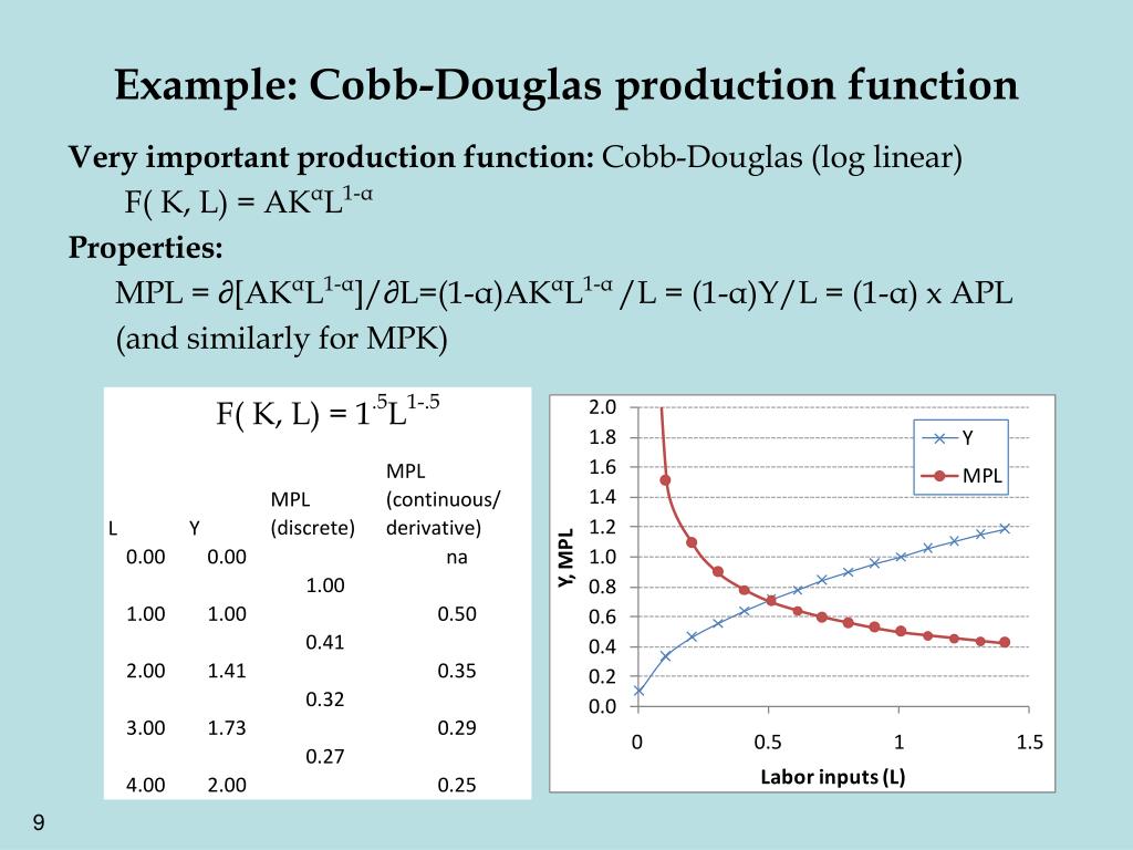 Example: Cobb-Douglas production function Very important production function: Cobb-Douglas (log linear) F( K, L) = AKαL1-α Properties: MPL = ∂[AKαL1-α]/∂L=(1-α)AKαL1-α /L = (1-α)Y/L = (1-α) x APL (and similarly for MPK)