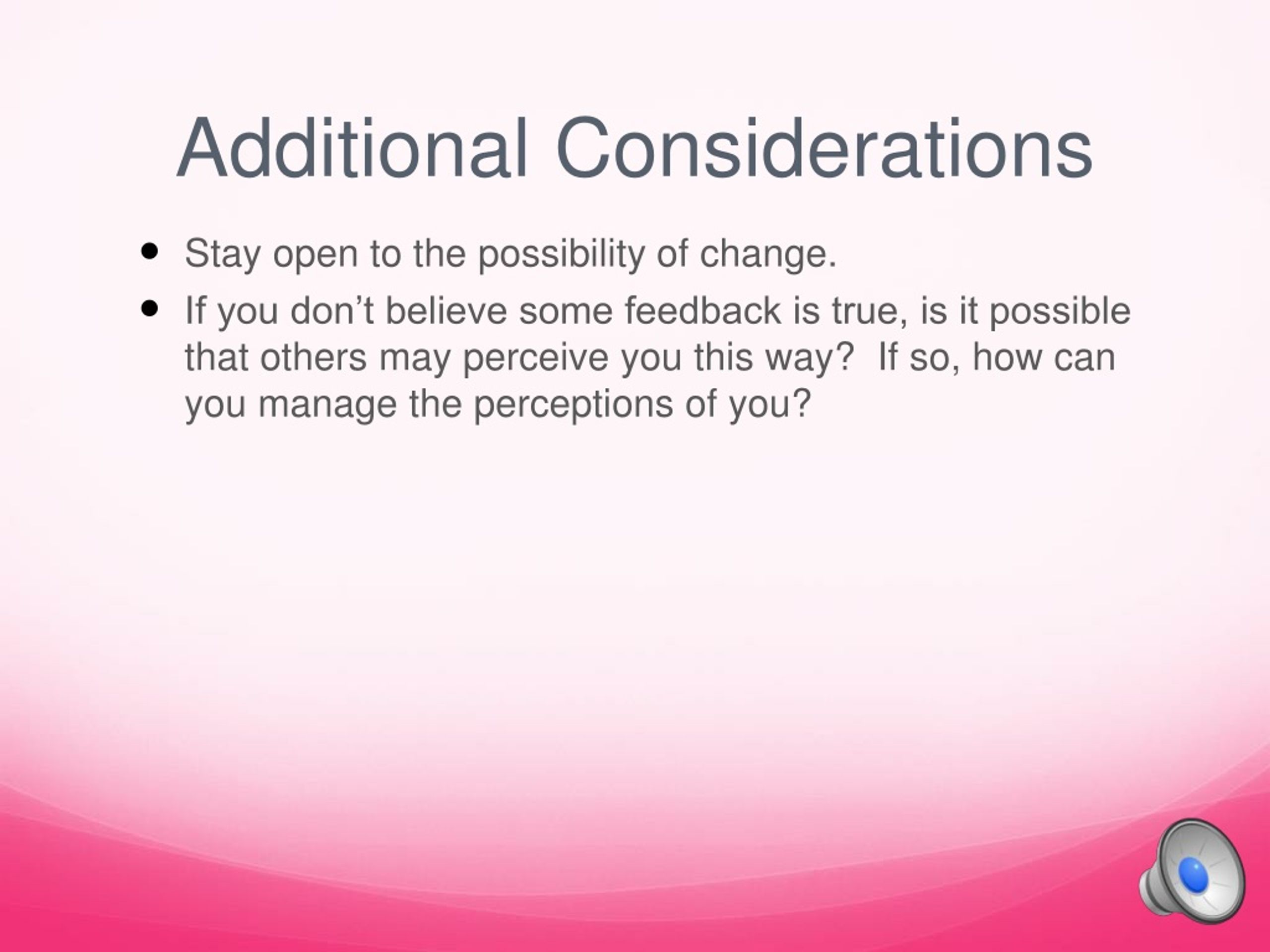 Additional Considerations • Stay open to the possibility of change. • If you don’t believe some feedback is true, is it possible that others may perceive you this way? If so, how can you manage the perceptions of you?
