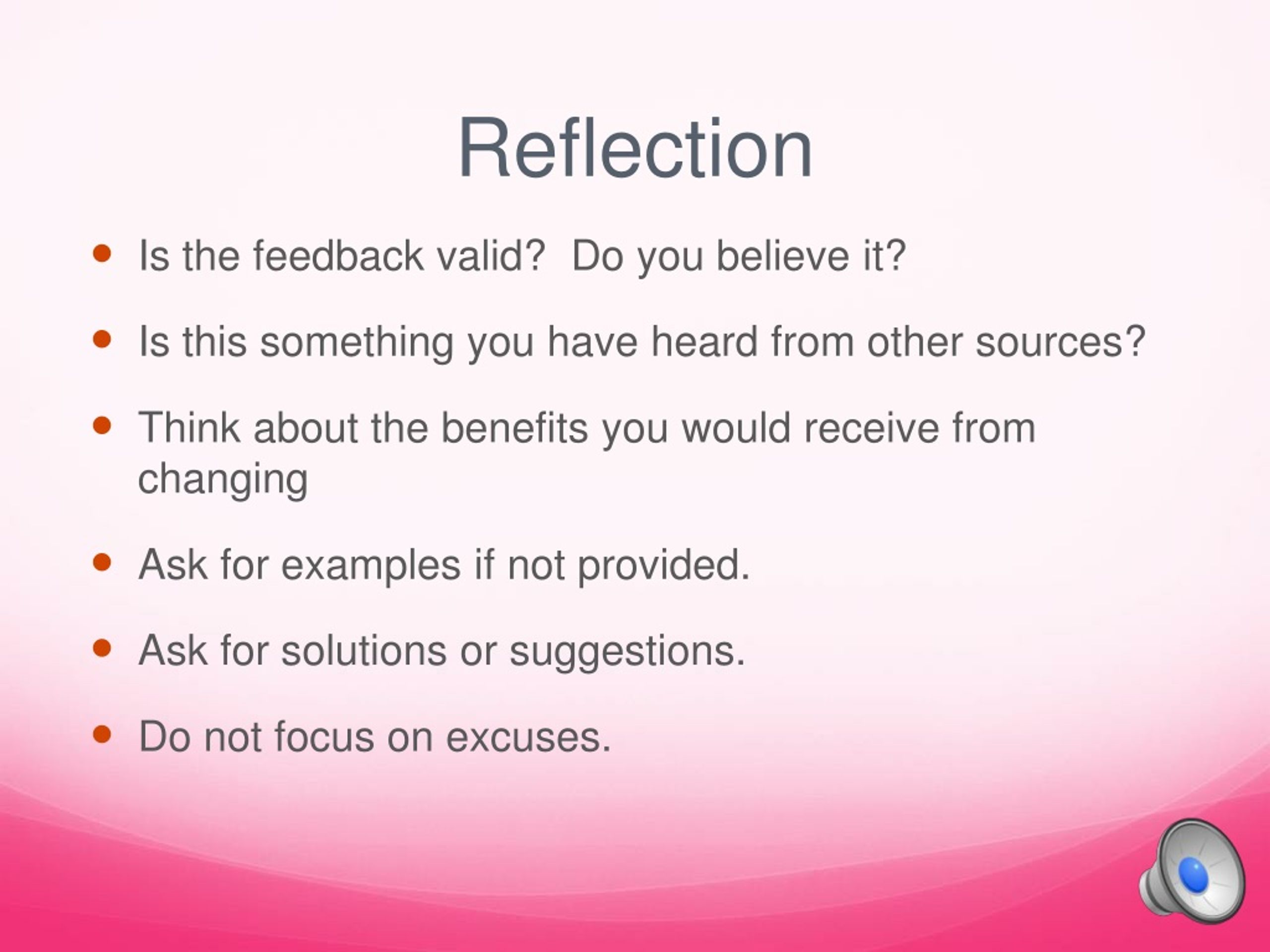 Reflection • Is the feedback valid? Do you believe it? • Is this something you have heard from other sources? • Think about the benefits you would receive from changing • Ask for examples if not provided. • Ask for solutions or suggestions. • Do not focus on excuses.