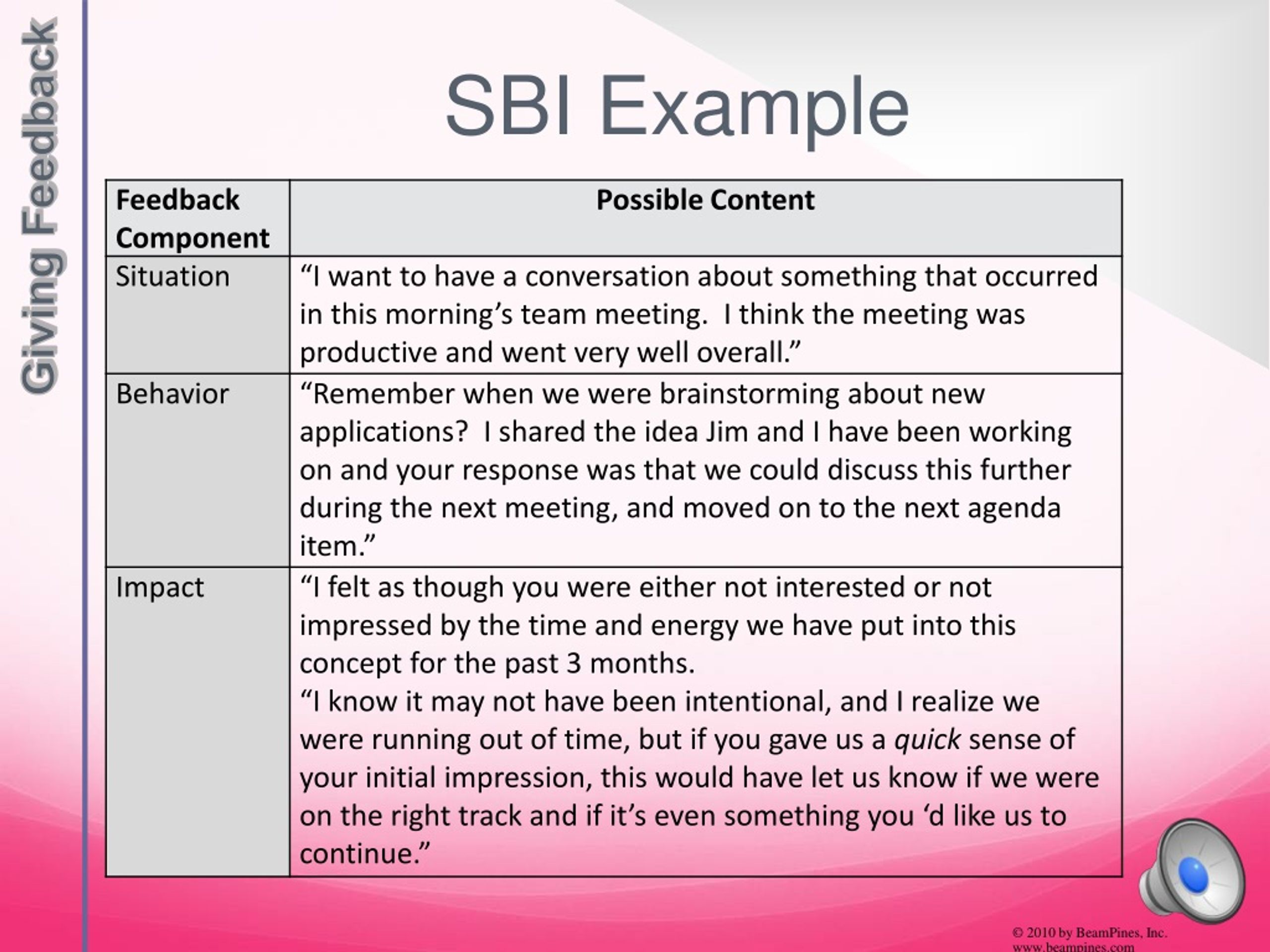 SBI Example Giving Feedback © 2010 by BeamPines, Inc. www.beampines.com