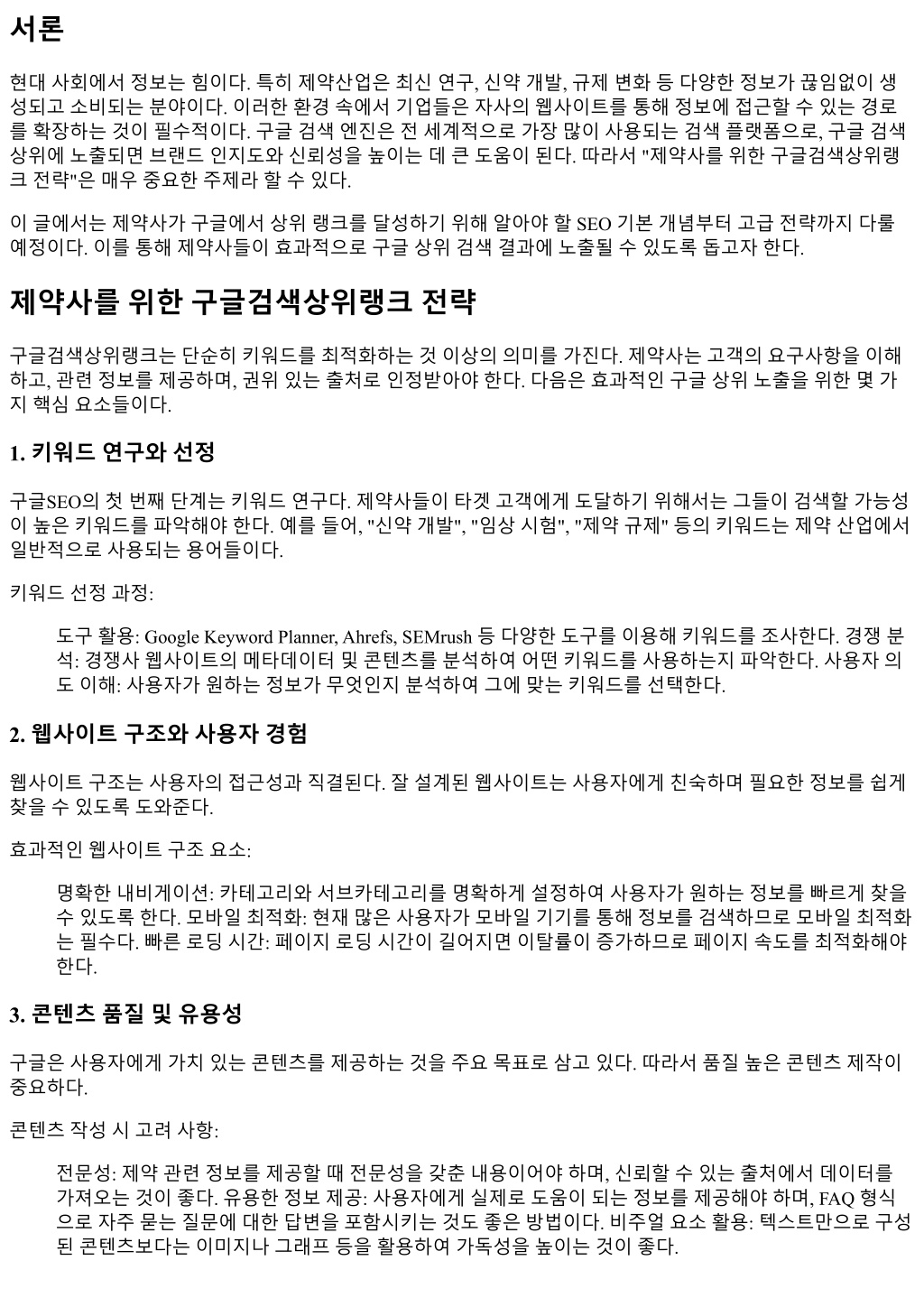 1. 서론 현대사회에서정보는힘이다. 특히제약산업은최신연구, 신약개발, 규제변화등다양한정보가끊임없이생 성되고소비되는분야이다. 이러한환경속에서기업들은자사의웹사이트를통해정보에접근할수있는경로 를확장하는것이필수적이다. 구글검색엔진은전세계적으로가장많이사용되는검색플랫폼으로, 구글검색 상위에노출되면브랜드인지도와신뢰성을높이는데큰도움이된다. 따라서 "제약사를위한구글검색상위랭 크전략"은매우중요한주제라할수있다. 이글에서는제약사가구글에서상위랭크를달성하기위해알아야할 SEO 기본개념부터고급전략까지다룰 예정이다. 이를통해제약사들이효과적으로구글상위검색결과에노출될수있도록돕고자한다. 제약사를위한구글검색상위랭크전략 구글검색상위랭크는단순히키워드를최적화하는것이상의의미를가진다. 제약사는고객의요구사항을이해 하고, 관련정보를제공하며, 권위있는출처로인정받아야한다. 다음은효과적인구글상위노출을위한몇가 지핵심요소들이다. 1. 키워드연구와선정 구글SEO의첫번째단계는키워드연구다. 제약사들이타겟고객에게도달하기위해서는그들이검색할가능성 이높은키워드를파악해야한다. 예를들어, "신약개발", "임상시험", "제약규제" 등의키워드는제약산업에서 일반적으로사용되는용어들이다. 키워드선정과정: 도구활용: Google Keyword Planner, Ahrefs, SEMrush 등다양한도구를이용해키워드를조사한다. 경쟁분 석: 경쟁사웹사이트의메타데이터및콘텐츠를분석하여어떤키워드를사용하는지파악한다. 사용자의 도이해: 사용자가원하는정보가무엇인지분석하여그에맞는키워드를선택한다. 2. 웹사이트구조와사용자경험 웹사이트구조는사용자의접근성과직결된다. 잘설계된웹사이트는사용자에게친숙하며필요한정보를쉽게 찾을수있도록도와준다. 효과적인웹사이트구조요소: 명확한내비게이션: 카테고리와서브카테고리를명확하게설정하여사용자가원하는정보를빠르게찾을 수있도록한다. 모바일최적화: 현재많은사용자가모바일기기를통해정보를검색하므로모바일최적화 는필수다. 빠른로딩시간: 페이지로딩시간이길어지면이탈률이증가하므로페이지속도를최적화해야 한다. 3. 콘텐츠품질및유용성 구글은사용자에게가치있는콘텐츠를제공하는것을주요목표로삼고있다. 따라서품질높은콘텐츠제작이 중요하다. 콘텐츠작성시고려사항: 전문성: 제약관련정보를제공할때전문성을갖춘내용이어야하며, 신뢰할수있는출처에서데이터를 가져오는것이좋다. 유용한정보제공: 사용자에게실제로도움이되는정보를제공해야하며, FAQ 형식 으로자주묻는질문에대한답변을포함시키는것도좋은방법이다. 비주얼요소활용: 텍스트만으로구성 된콘텐츠보다는이미지나그래프등을활용하여가독성을높이는것이좋다.