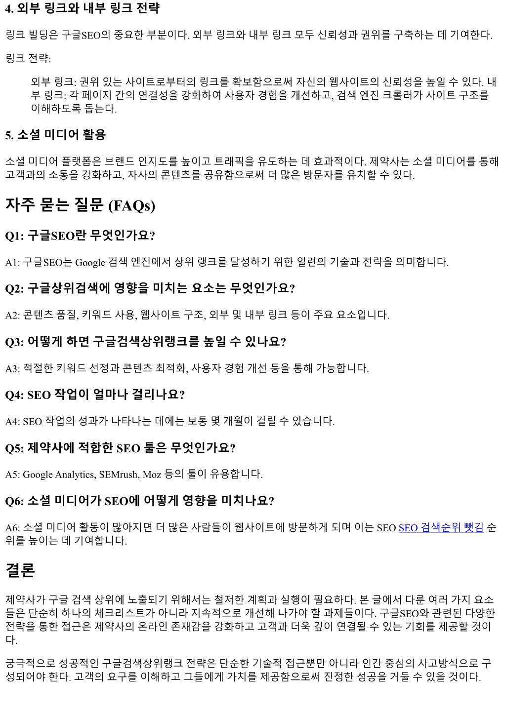 2. 4. 외부링크와내부링크전략 링크빌딩은구글SEO의중요한부분이다. 외부링크와내부링크모두신뢰성과권위를구축하는데기여한다. 링크전략: 외부링크: 권위있는사이트로부터의링크를확보함으로써자신의웹사이트의신뢰성을높일수있다. 내 부링크: 각페이지간의연결성을강화하여사용자경험을개선하고, 검색엔진크롤러가사이트구조를 이해하도록돕는다. 5. 소셜미디어활용 소셜미디어플랫폼은브랜드인지도를높이고트래픽을유도하는데효과적이다. 제약사는소셜미디어를통해 고객과의소통을강화하고, 자사의콘텐츠를공유함으로써더많은방문자를유치할수있다. 자주묻는질문 (FAQs) Q1: 구글SEO란무엇인가요? A1: 구글SEO는 Google 검색엔진에서상위랭크를달성하기위한일련의기술과전략을의미합니다. Q2: 구글상위검색에영향을미치는요소는무엇인가요? A2: 콘텐츠품질, 키워드사용, 웹사이트구조, 외부및내부링크등이주요요소입니다. Q3: 어떻게하면구글검색상위랭크를높일수있나요? A3: 적절한키워드선정과콘텐츠최적화, 사용자경험개선등을통해가능합니다. Q4: SEO 작업이얼마나걸리나요? A4: SEO 작업의성과가나타나는데에는보통몇개월이걸릴수있습니다. Q5: 제약사에적합한 SEO 툴은무엇인가요? A5: Google Analytics, SEMrush, Moz 등의툴이유용합니다. Q6: 소셜미디어가 SEO에어떻게영향을미치나요? A6: 소셜미디어활동이많아지면더많은사람들이웹사이트에방문하게되며이는 SEO SEO 검색순위뺏김순 위를높이는데기여합니다. 결론 제약사가구글검색상위에노출되기위해서는철저한계획과실행이필요하다. 본글에서다룬여러가지요소 들은단순히하나의체크리스트가아니라지속적으로개선해나가야할과제들이다. 구글SEO와관련된다양한 전략을통한접근은제약사의온라인존재감을강화하고고객과더욱깊이연결될수있는기회를제공할것이 다. 궁극적으로성공적인구글검색상위랭크전략은단순한기술적접근뿐만아니라인간중심의사고방식으로구 성되어야한다. 고객의요구를이해하고그들에게가치를제공함으로써진정한성공을거둘수있을것이다.