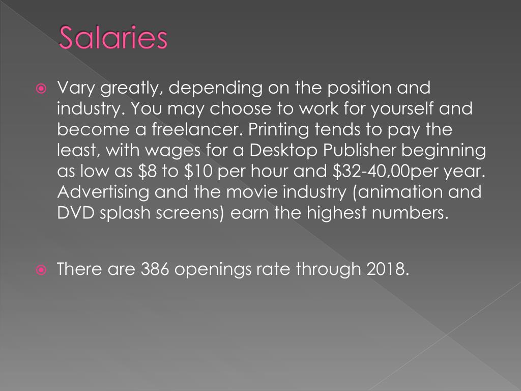 Salaries • Vary greatly, depending on the position and industry. You may choose to work for yourself and become a freelancer. Printing tends to pay the least, with wages for a Desktop Publisher beginning as low as $8 to $10 per hour and $32-40,00per year. Advertising and the movie industry (animation and DVD splash screens) earn the highest numbers. • There are 386 openings rate through 2018.
