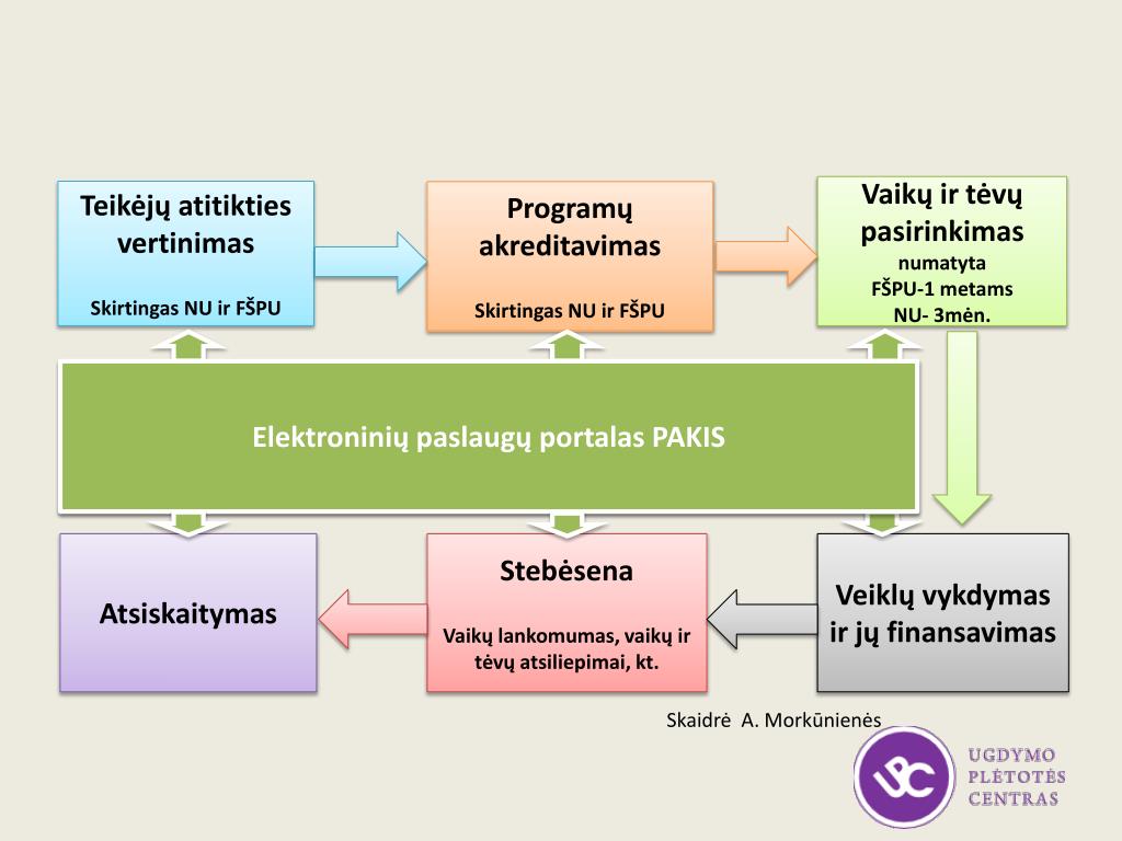 Vaikų ir tėvų pasirinkimas numatyta FŠPU-1 metams NU- 3mėn. Teikėjų atitikties vertinimas Skirtingas NU ir FŠPU Programų akreditavimas Skirtingas NU ir FŠPU Elektroninių paslaugų portalasPAKIS Atsiskaitymas Stebėsena Vaikų lankomumas, vaikų ir tėvų atsiliepimai, kt. Veiklų vykdymas ir jų finansavimas Skaidrė A. Morkūnienės