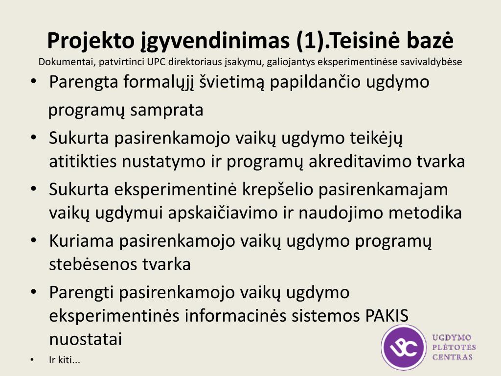 Projekto įgyvendinimas (1).Teisinė bazėDokumentai, patvirtinci UPC direktoriaus įsakymu, galiojantys eksperimentinėse savivaldybėse • Parengta formalųjį švietimą papildančio ugdymo programų samprata • Sukurta pasirenkamojo vaikų ugdymoteikėjų atitikties nustatymo ir programų akreditavimo tvarka • Sukurta eksperimentinė krepšelio pasirenkamajam vaikų ugdymui apskaičiavimo ir naudojimo metodika • Kuriama pasirenkamojo vaikų ugdymo programų stebėsenos tvarka • Parengti pasirenkamojo vaikų ugdymo eksperimentinės informacinės sistemos PAKIS nuostatai • Ir kiti...