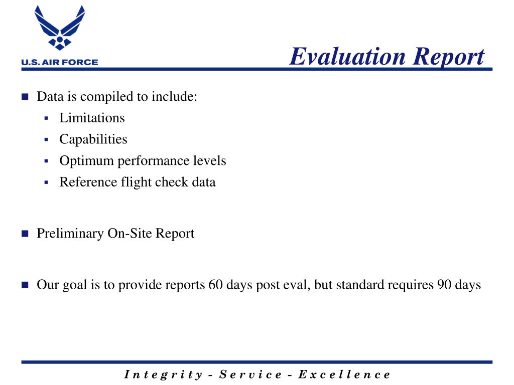 Evaluation Report • Data is compiled to include: • Limitations • Capabilities • Optimum performance levels • Reference flight check data • Preliminary On-Site Report • Our goal is to provide reports 60 days post eval, but standard requires 90 days