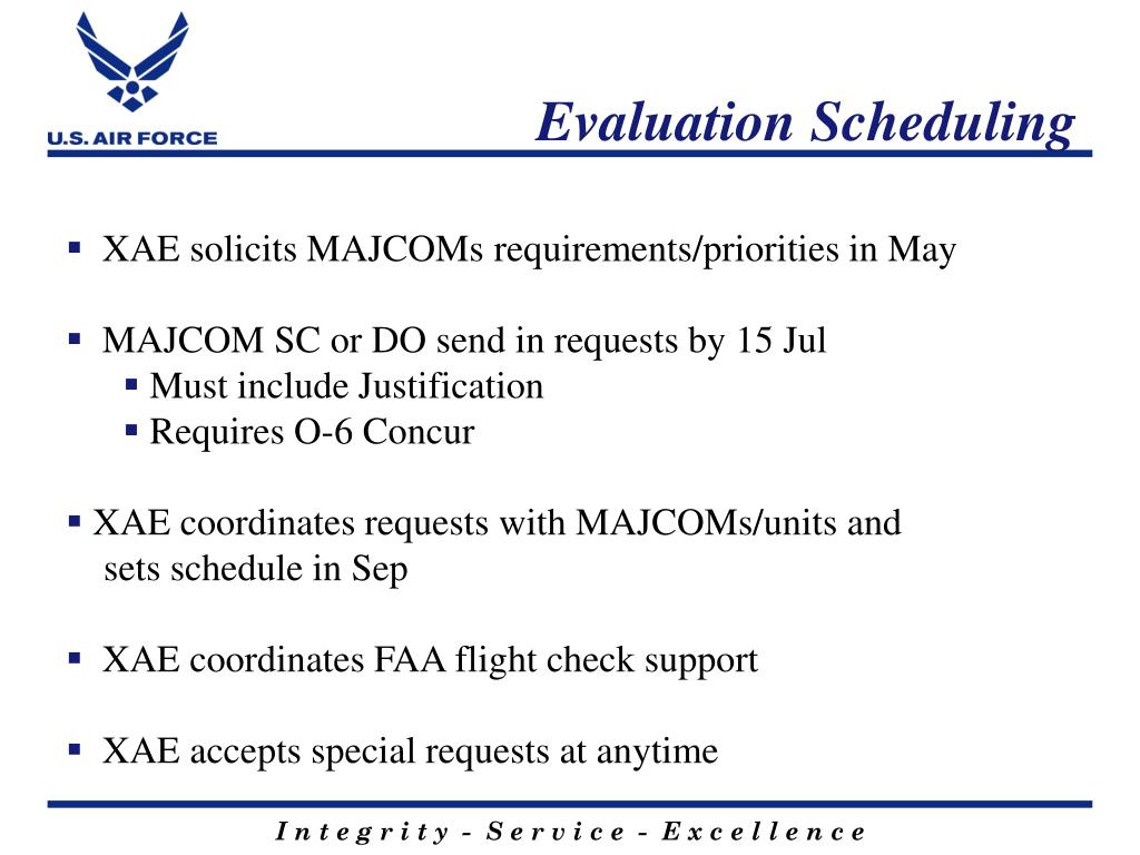 Evaluation Scheduling • XAE solicits MAJCOMs requirements/priorities in May • MAJCOM SC or DO send in requests by 15 Jul • Must include Justification • Requires O-6 Concur • XAE coordinates requests with MAJCOMs/units and sets schedule in Sep • XAE coordinates FAA flight check support • XAE accepts special requests at anytime