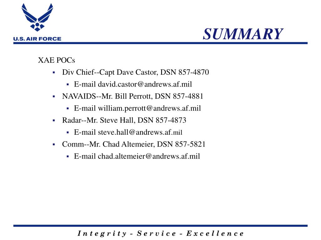 SUMMARY XAE POCs • Div Chief--Capt Dave Castor, DSN 857-4870 • E-mail david.castor@andrews.af.mil • NAVAIDS--Mr. Bill Perrott, DSN 857-4881 • E-mail william.perrott@andrews.af.mil • Radar--Mr. Steve Hall, DSN 857-4873 • E-mail steve.hall@andrews.af.mil • Comm--Mr. Chad Altemeier, DSN 857-5821 • E-mail chad.altemeier@andrews.af.mil