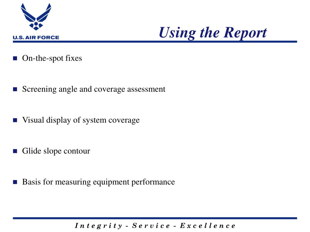 Using the Report • On-the-spot fixes • Screening angle and coverage assessment • Visual display of system coverage • Glide slope contour • Basis for measuring equipment performance