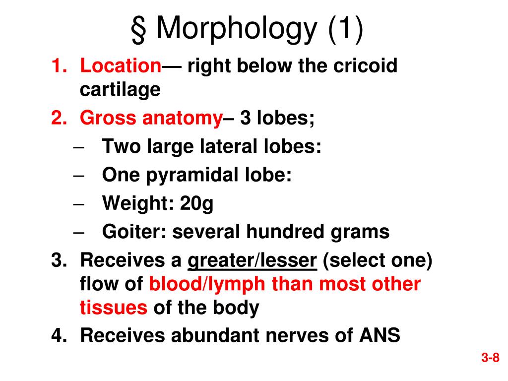 § Morphology (1) • Location— right below the cricoid cartilage • Gross anatomy– 3 lobes; • Two large lateral lobes: • One pyramidal lobe: • Weight: 20g • Goiter: several hundred grams • Receives a greater/lesser (select one) flow of blood/lymph than most other tissues of the body • Receives abundant nerves of ANS