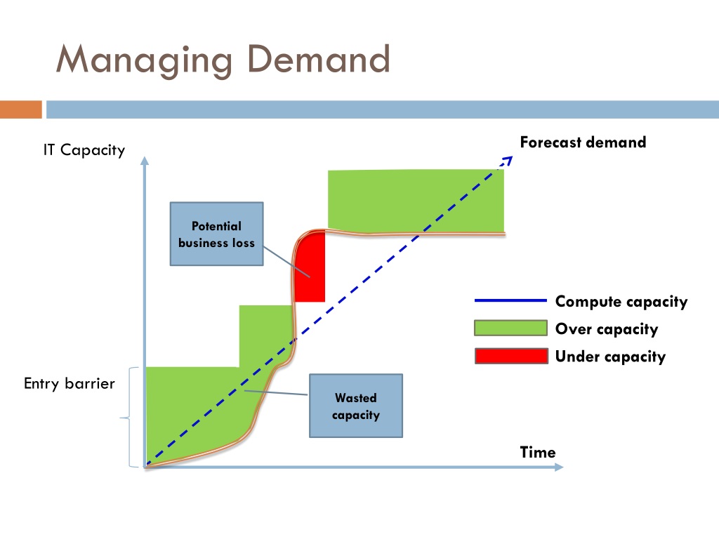 Managing Demand Forecast demand IT Capacity Potential business loss Compute capacity Over capacity Under capacity Entry barrier Wasted capacity Time