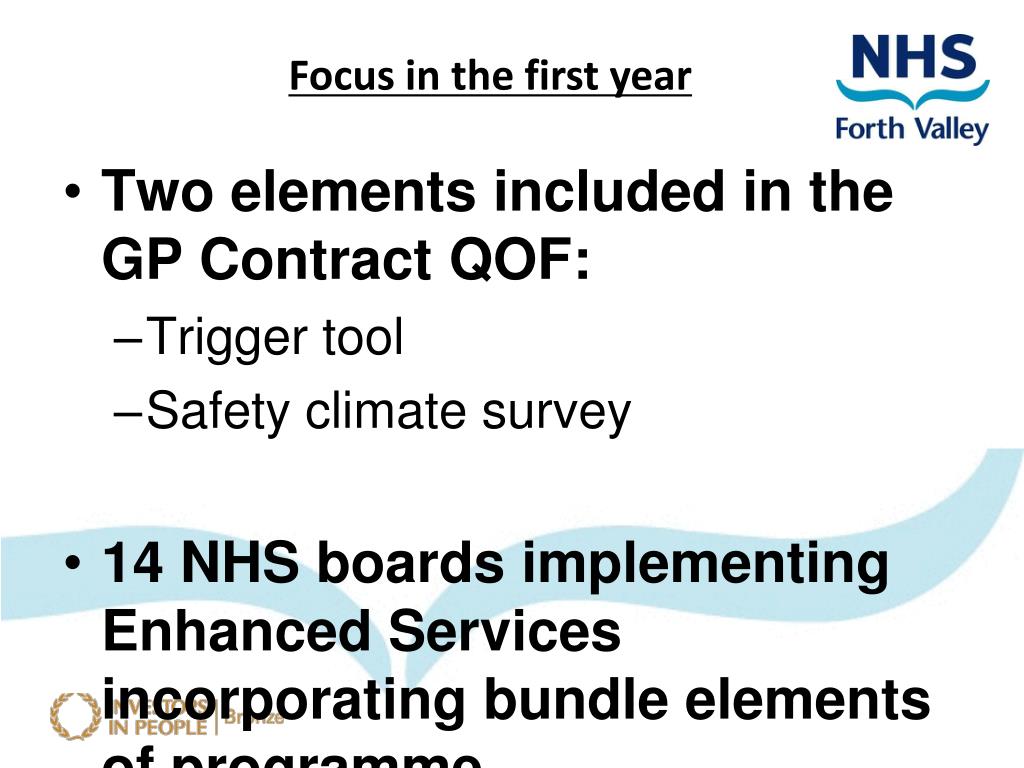 Focus in the first year • Two elements included in the GP Contract QOF: • Trigger tool • Safety climate survey • 14 NHS boards implementing Enhanced Services incorporating bundle elements of programme • warfarin, • DMARDs, and • medicines reconciliation