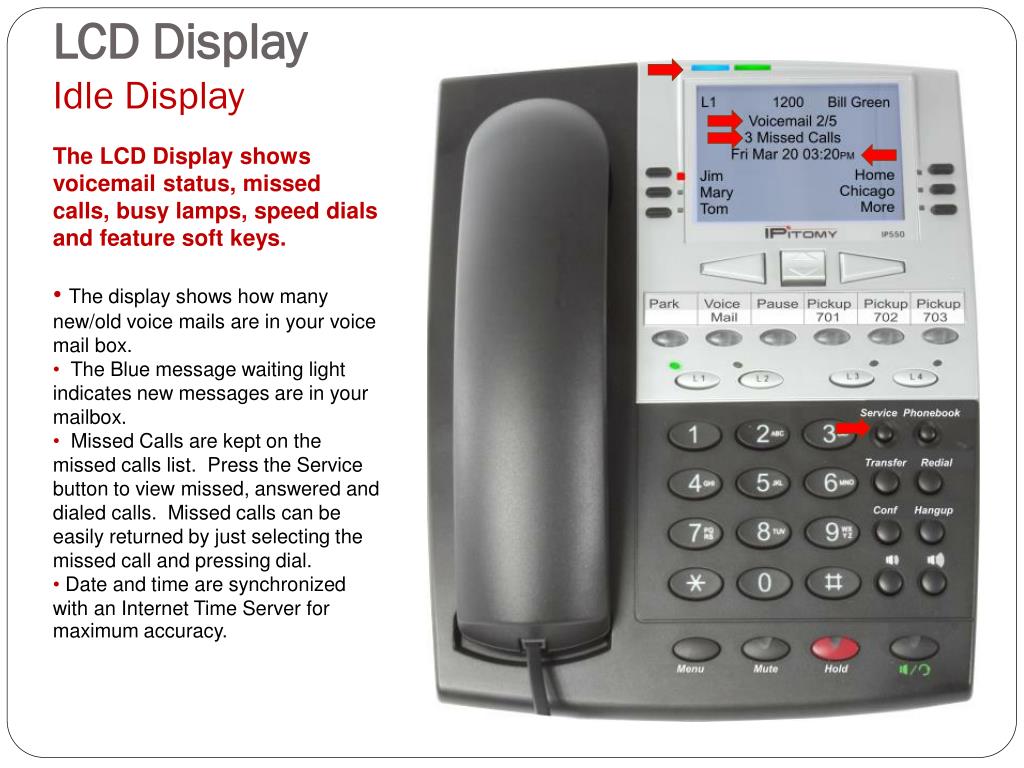LCD DisplayIdle Display • The LCD Display shows voicemail status, missed calls, busy lamps, speed dials and feature soft keys. • The display shows how many new/old voice mails are in your voice mail box. • The Blue message waiting light indicates new messages are in your mailbox. • Missed Calls are kept on the missed calls list. Press the Service button to view missed, answered and dialed calls. Missed calls can be easily returned by just selecting the missed call and pressing dial. • Date and time are synchronized with an Internet Time Server for maximumaccuracy.