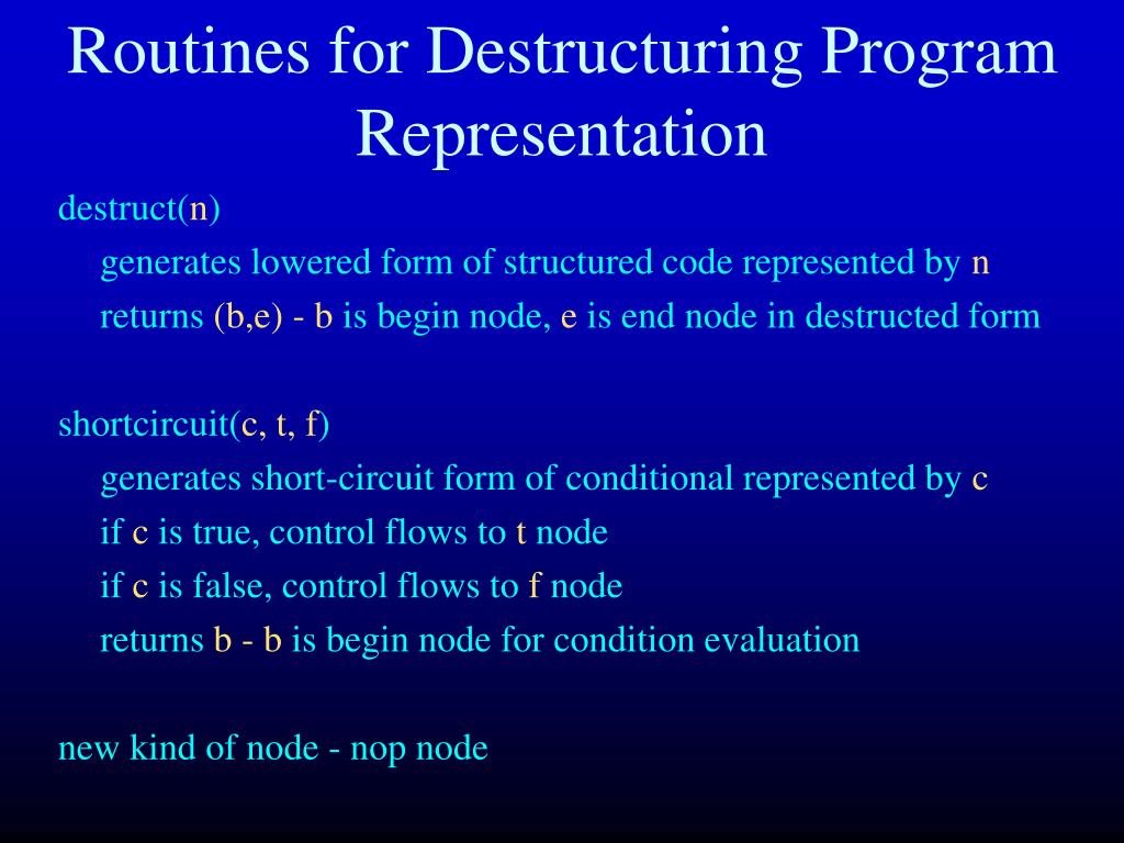 Routines for Destructuring Program Representation destruct(n) generates lowered form of structured code represented by n returns (b,e) - b is begin node, e is end node in destructed form shortcircuit(c, t, f) generates short-circuit form of conditional represented by c if c is true, control flows to t node if c is false, control flows to f node returns b - b is begin node for condition evaluation new kind of node - nop node