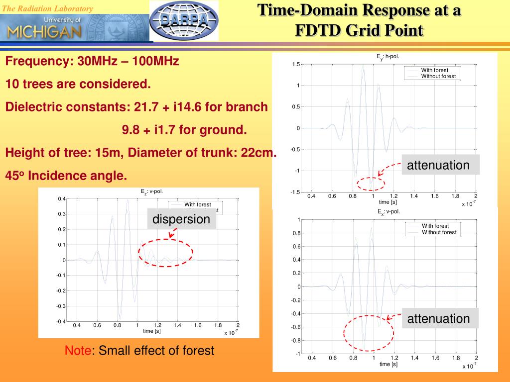 attenuation dispersion attenuation Time-Domain Response at a FDTD Grid Point Frequency: 30MHz – 100MHz 10 trees are considered. Dielectric constants: 21.7 + i14.6 for branch 9.8 + i1.7 for ground. Height of tree: 15m, Diameter of trunk: 22cm. 45o Incidence angle. Note: Small effect of forest