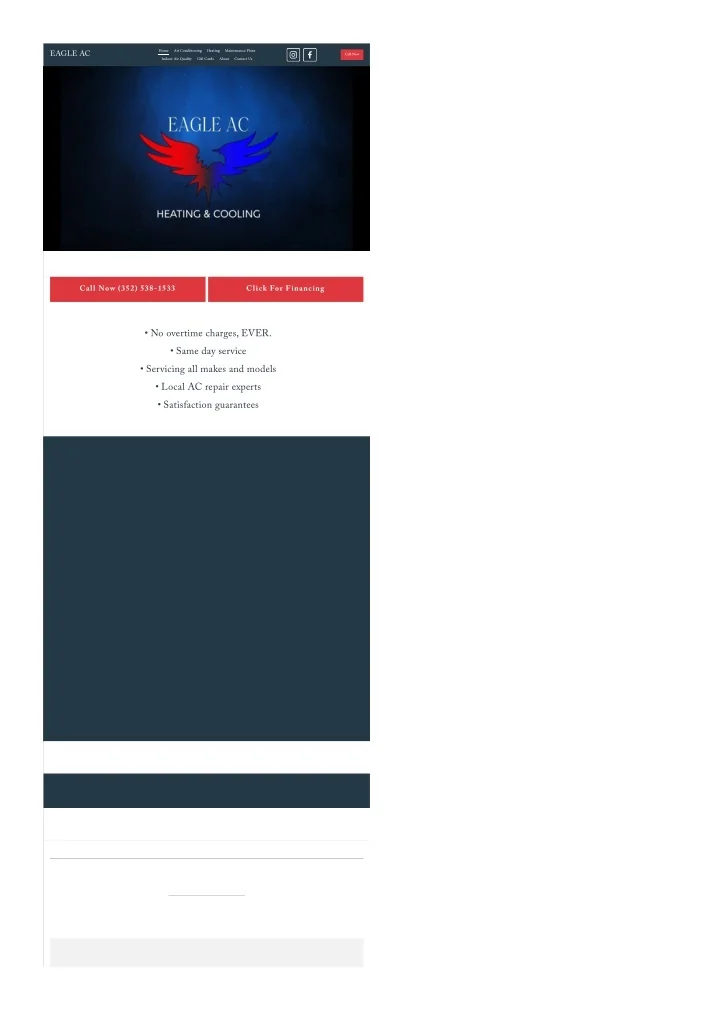 Home Air Conditioning Heating Maintenance Plans EAGLE AC Call Now Indoor Air Quality Gift Cards About Contact Us Call Now (352) 538-1533 Click For Financing • No overtime charges, EVER. • Same day service • Servicing all makes and models • Local AC repair experts • Satisfaction guarantees