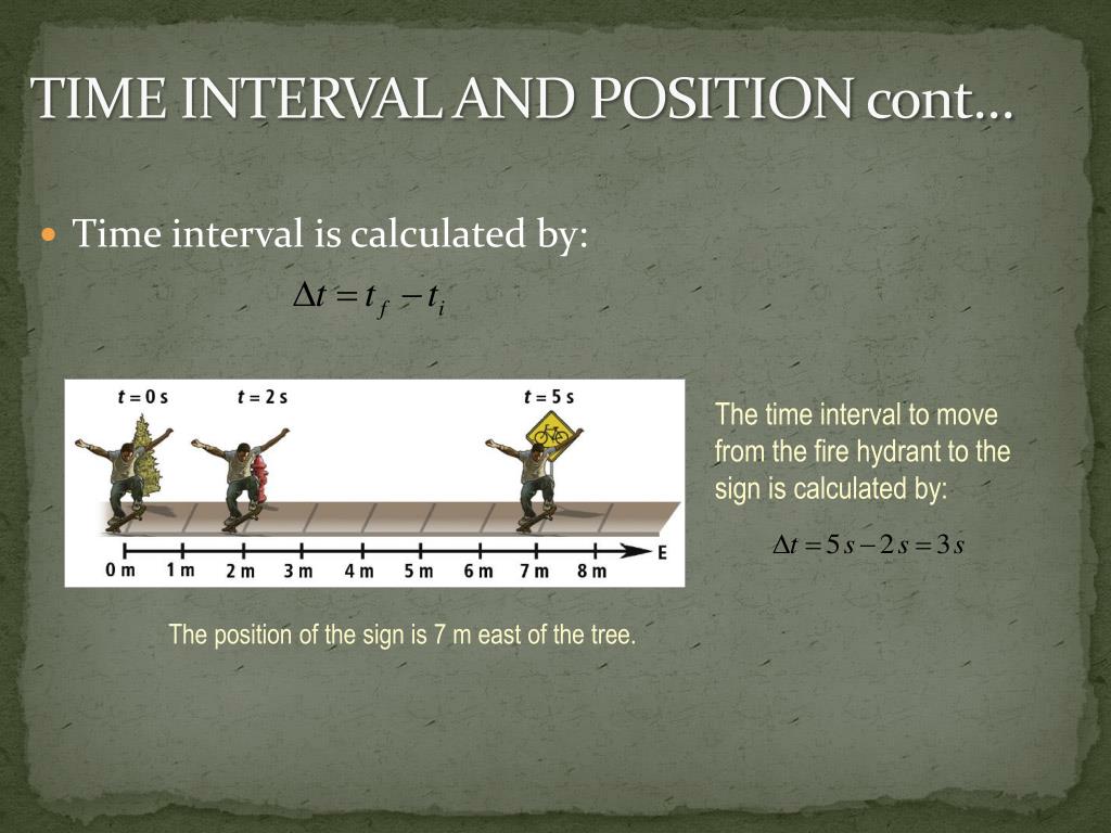TIME INTERVAL AND POSITION cont… • Time interval is calculated by: The time interval to move from the fire hydrant to the sign is calculated by: The position of the sign is 7 m east of the tree.