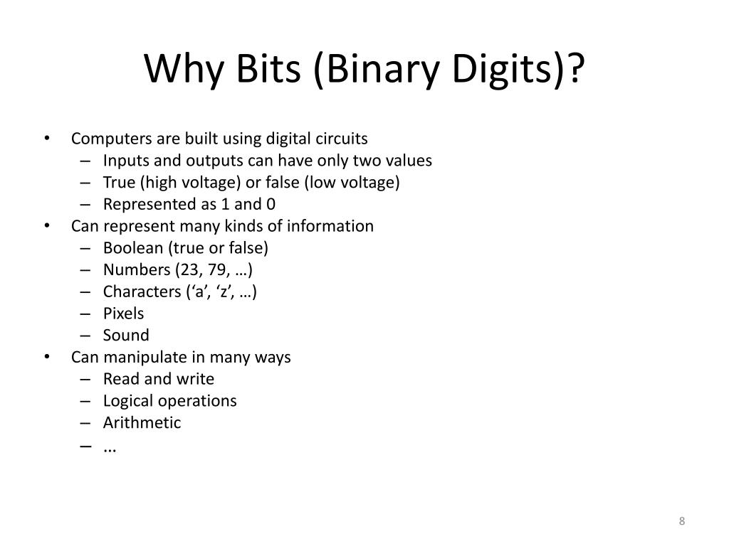 Why Bits (Binary Digits)? • Computers are built using digital circuits • Inputs and outputs can have only two values • True (high voltage) or false (low voltage) • Represented as 1 and 0 • Can represent many kinds of information • Boolean (true or false) • Numbers (23, 79, …) • Characters (‘a’, ‘z’, …) • Pixels • Sound • Can manipulate in many ways • Read and write • Logical operations • Arithmetic • …