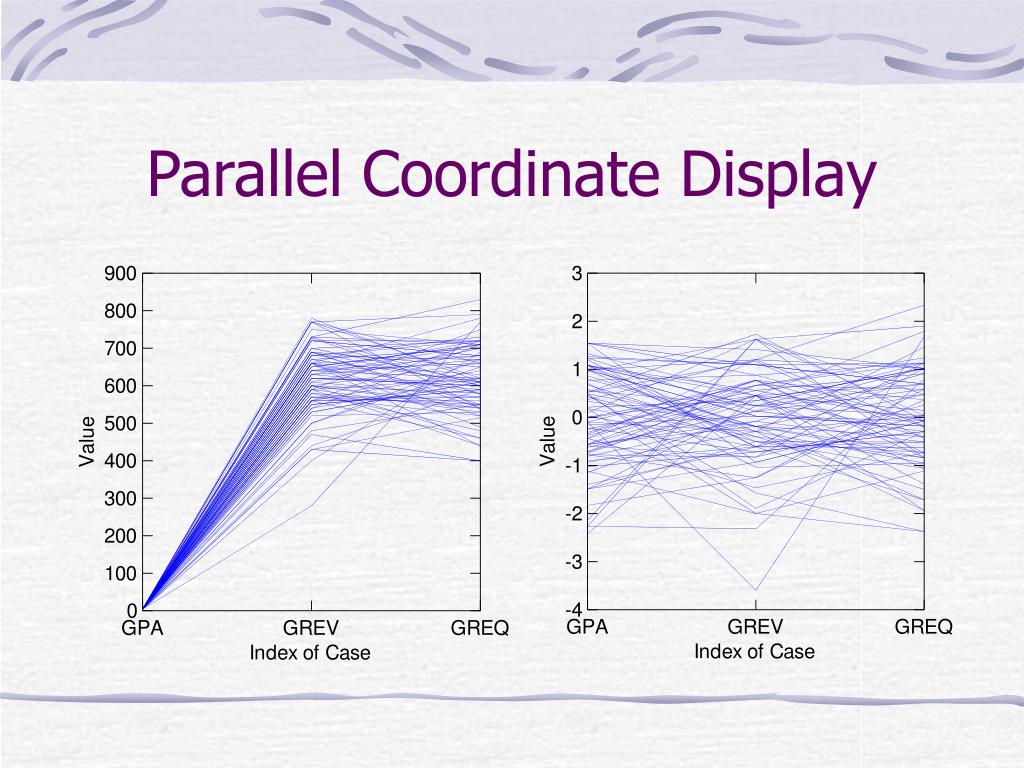 Parallel Coordinate Display • Examine response pattern across variables • Used to be conducted in BMDP Diamond, but SyStat has this feature • Unstandardized PCD may not be useful when the scales vary.