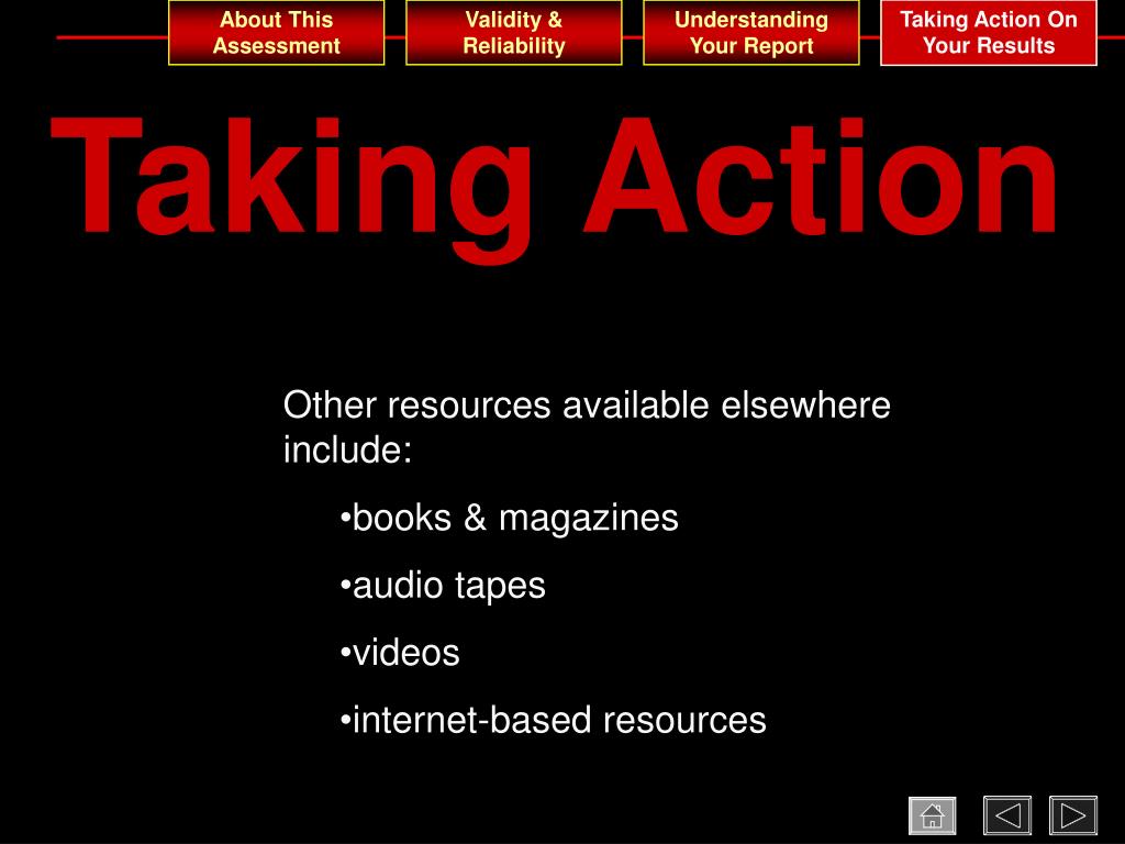 Taking Action On Your Results Taking Action • Other resources available elsewhere include: • books & magazines • audio tapes • videos • internet-based resources