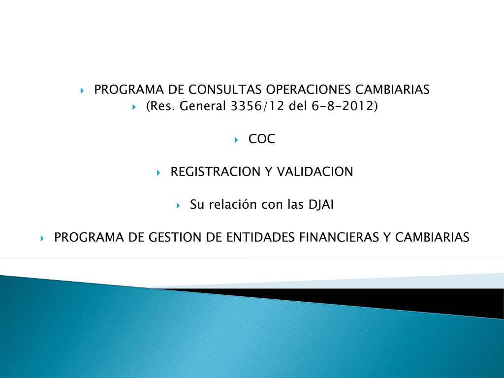 PROGRAMA DE CONSULTAS OPERACIONES CAMBIARIAS (Res. General 3356/12 del 6-8-2012) COC REGISTRACION Y VALIDACION Su relación con las DJAI PROGRAMA DE GESTION DE ENTIDADES FINANCIERAS Y CAMBIARIAS