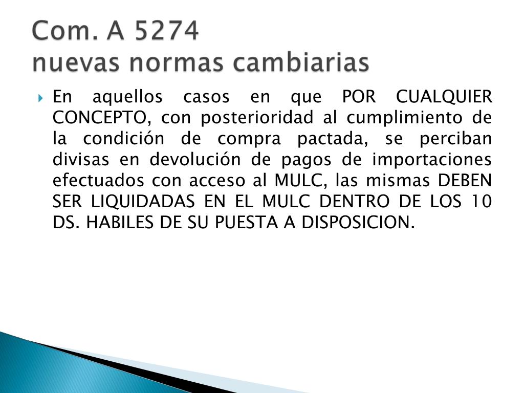 En aquellos casos en que POR CUALQUIER CONCEPTO, con posterioridad al cumplimiento de la condición de compra pactada, se perciban divisas en devolución de pagos de importaciones efectuados con acceso al MULC, las mismas DEBEN SER LIQUIDADAS EN EL MULC DENTRO DE LOS 10 DS. HABILES DE SU PUESTA A DISPOSICION.