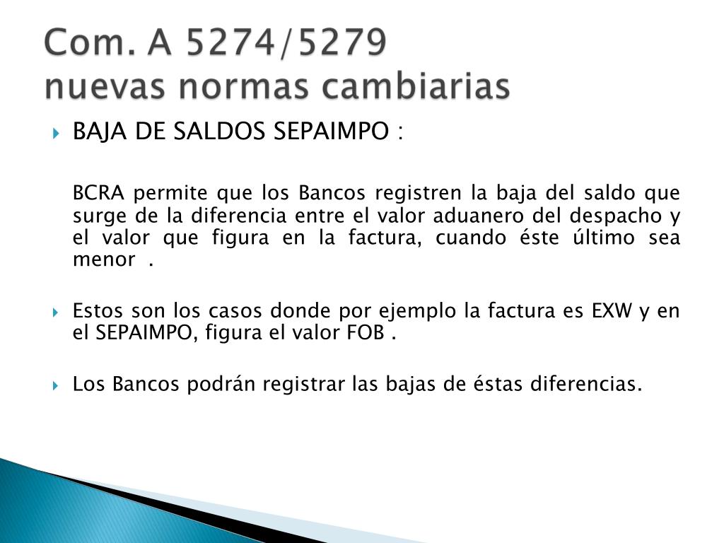 BAJA DE SALDOS SEPAIMPO : BCRA permite que los Bancos registren la baja del saldo que surge de la diferencia entre el valor aduanero del despacho y el valor que figura en la factura, cuando éste último sea menor . • Estos son los casos donde por ejemplo la factura es EXW y en el SEPAIMPO, figura el valor FOB . • Los Bancos podrán registrar las bajas de éstas diferencias.