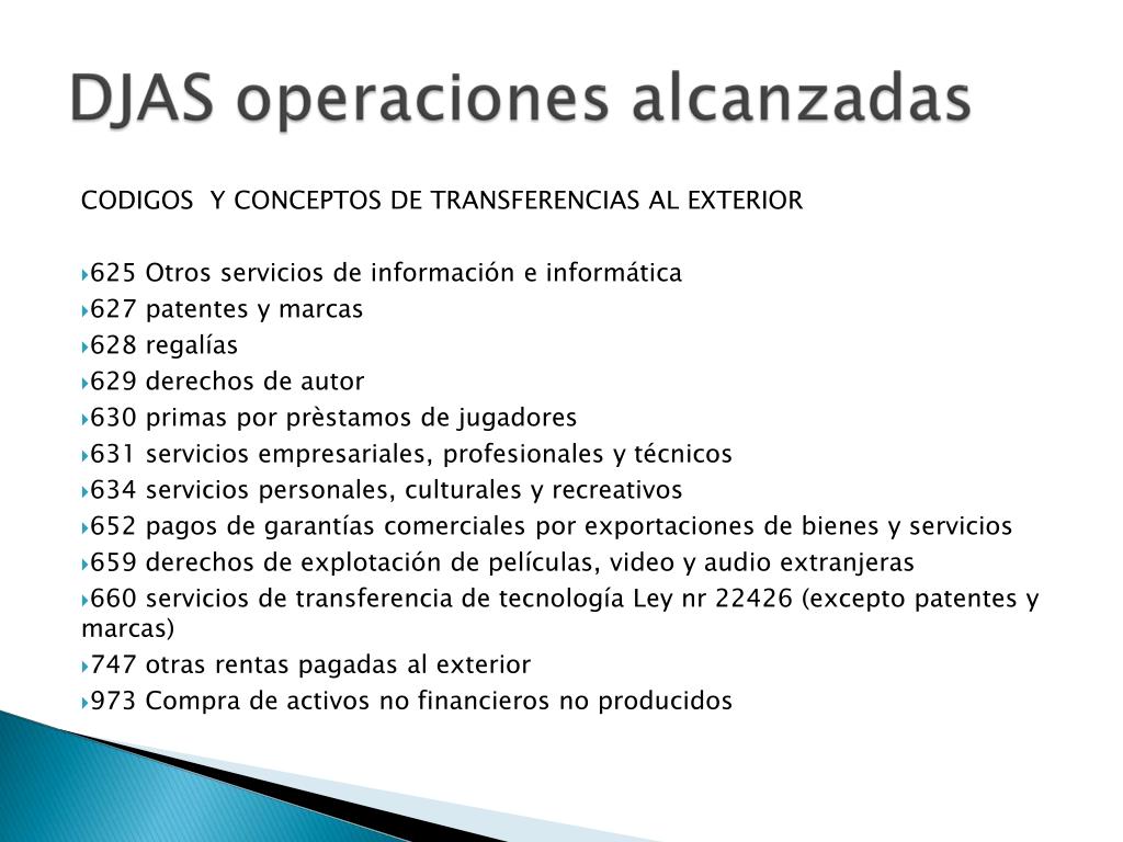 CODIGOS Y CONCEPTOS DE TRANSFERENCIAS AL EXTERIOR • 625 Otros servicios de información e informática • 627 patentes y marcas • 628 regalías • 629 derechos de autor • 630 primas por prèstamos de jugadores • 631 servicios empresariales, profesionales y técnicos • 634 servicios personales, culturales y recreativos • 652 pagos de garantías comerciales por exportaciones de bienes y servicios • 659 derechos de explotación de películas, video y audio extranjeras • 660 servicios de transferencia de tecnología Ley nr 22426 (excepto patentes y marcas) • 747 otras rentas pagadas al exterior • 973 Compra de activos no financieros no producidos