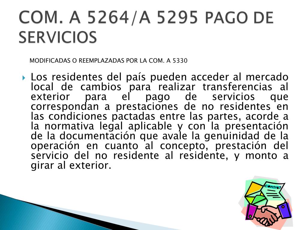 MODIFICADAS O REEMPLAZADAS POR LA COM. A 5330 • Los residentes del país pueden acceder al mercado local de cambios para realizar transferencias al exterior para el pago de servicios que correspondan a prestaciones de no residentes en las condiciones pactadas entre las partes, acorde a la normativa legal aplicable y con la presentación de la documentación que avale la genuinidad de la operación en cuanto al concepto, prestación del servicio del no residente al residente, y monto a girar al exterior.