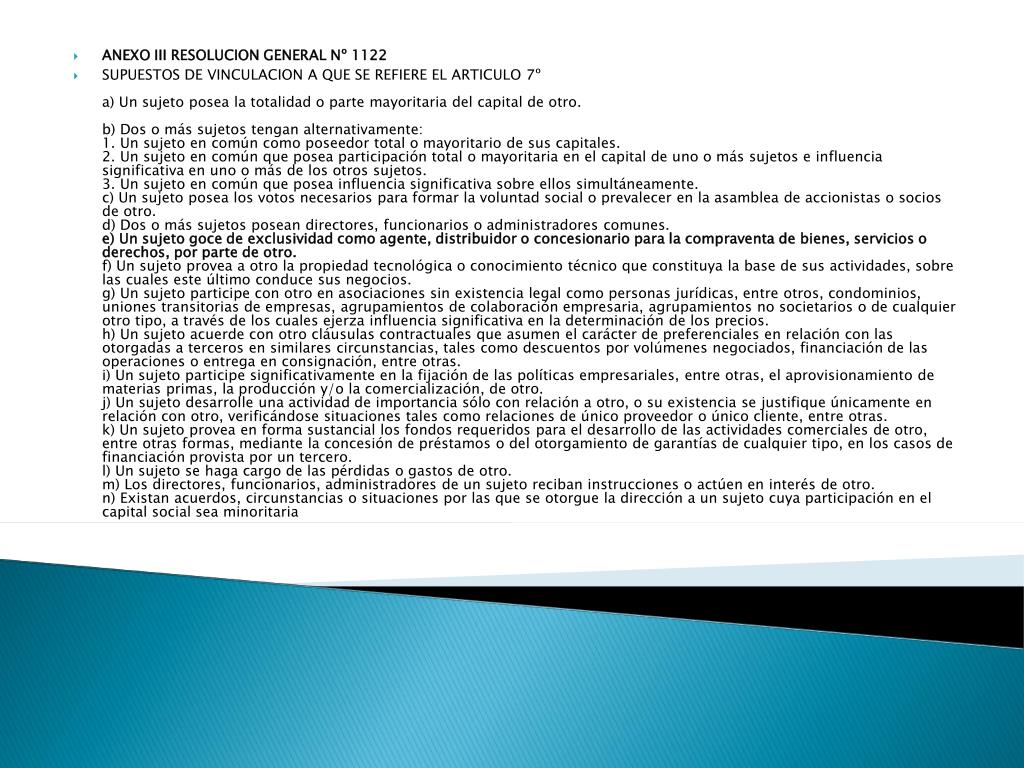 ANEXO III RESOLUCION GENERAL Nº 1122 SUPUESTOS DE VINCULACION A QUE SE REFIERE EL ARTICULO 7ºa) Un sujeto posea la totalidad o parte mayoritaria del capital de otro.b) Dos o más sujetos tengan alternativamente:1. Un sujeto en común como poseedor total o mayoritario de sus capitales.2. Un sujeto en común que posea participación total o mayoritaria en el capital de uno o más sujetos e influencia significativa en uno o más de los otros sujetos.3. Un sujeto en común que posea influencia significativa sobre ellos simultáneamente.c) Un sujeto posea los votos necesarios para formar la voluntad social o prevalecer en la asamblea de accionistas o socios de otro.d) Dos o más sujetos posean directores, funcionarios o administradores comunes.e) Un sujeto goce de exclusividad como agente, distribuidor o concesionario para la compraventa de bienes, servicios o derechos, por parte de otro.f) Un sujeto provea a otro la propiedad tecnológica o conocimiento técnico que constituya la base de sus actividades, sobre las cuales este último conduce sus negocios.g) Un sujeto participe con otro en asociaciones sin existencia legal como personas jurídicas, entre otros, condominios, uniones transitorias de empresas, agrupamientos de colaboración empresaria, agrupamientos no societarios o de cualquier otro tipo, a través de los cuales ejerza influencia significativa en la determinación de los precios.h) Un sujeto acuerde con otro cláusulas contractuales que asumen el carácter de preferenciales en relación con las otorgadas a terceros en similares circunstancias, tales como descuentos por volúmenes negociados, financiación de las operaciones o entrega en consignación, entre otras.i) Un sujeto participe significativamente en la fijación de las políticas empresariales, entre otras, el aprovisionamiento de materias primas, la producción y/o la comercialización, de otro.j) Un sujeto desarrolle una actividad de importancia sólo con relación a otro, o su existencia se justifique únicamente en relación con otro, verificándose situaciones tales como relaciones de único proveedor o único cliente, entre otras.k) Un sujeto provea en forma sustancial los fondos requeridos para el desarrollo de las actividades comerciales de otro, entre otras formas, mediante la concesión de préstamos o del otorgamiento de garantías de cualquier tipo, en los casos de financiación provista por un tercero.l) Un sujeto se haga cargo de las pérdidas o gastos de otro.m) Los directores, funcionarios, administradores de un sujeto reciban instrucciones o actúen en interés de otro.n) Existan acuerdos, circunstancias o situaciones por las que se otorgue la dirección a un sujeto cuya participación en el capital social sea minoritaria