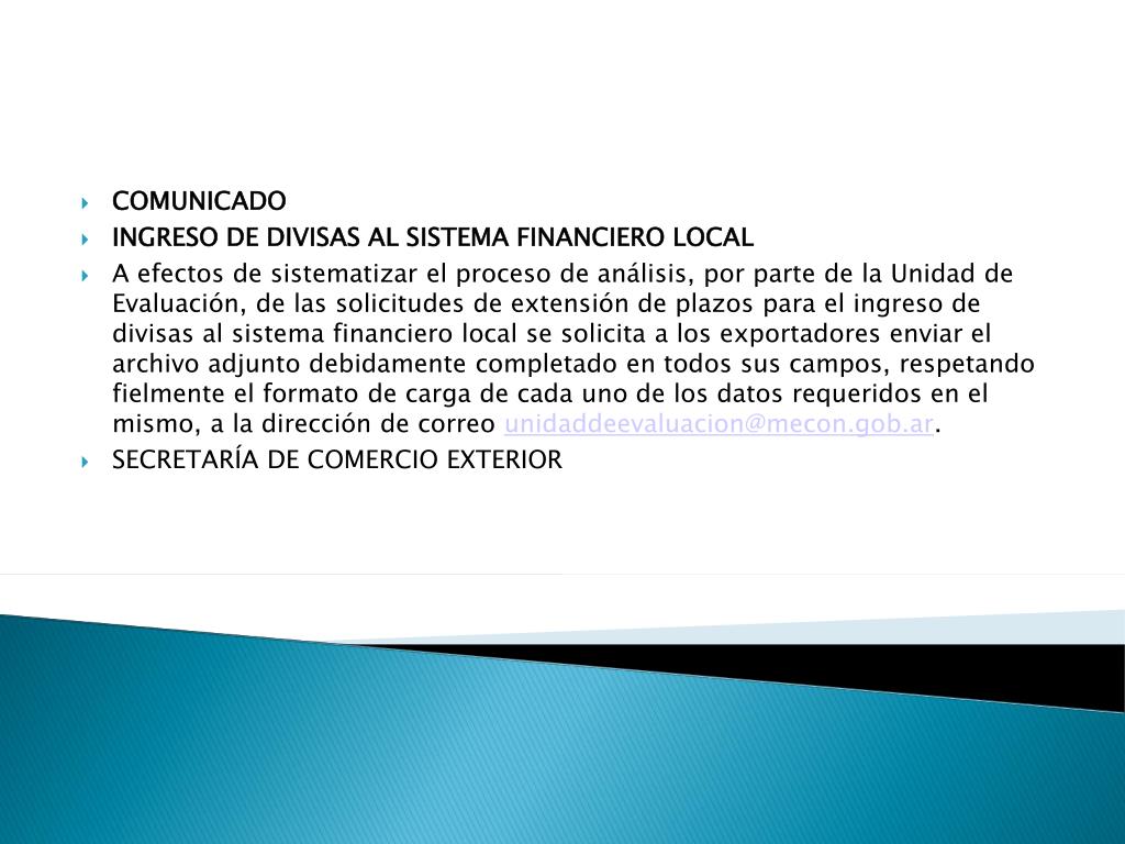 COMUNICADO INGRESO DE DIVISAS AL SISTEMA FINANCIERO LOCAL A efectos de sistematizar el proceso de análisis, por parte de la Unidad de Evaluación, de las solicitudes de extensión de plazos para el ingreso de divisas al sistema financiero local se solicita a los exportadores enviar el archivo adjunto debidamente completado en todos sus campos, respetando fielmente el formato de carga de cada uno de los datos requeridos en el mismo, a la dirección de correo unidaddeevaluacion@mecon.gob.ar. SECRETARÍA DE COMERCIO EXTERIOR