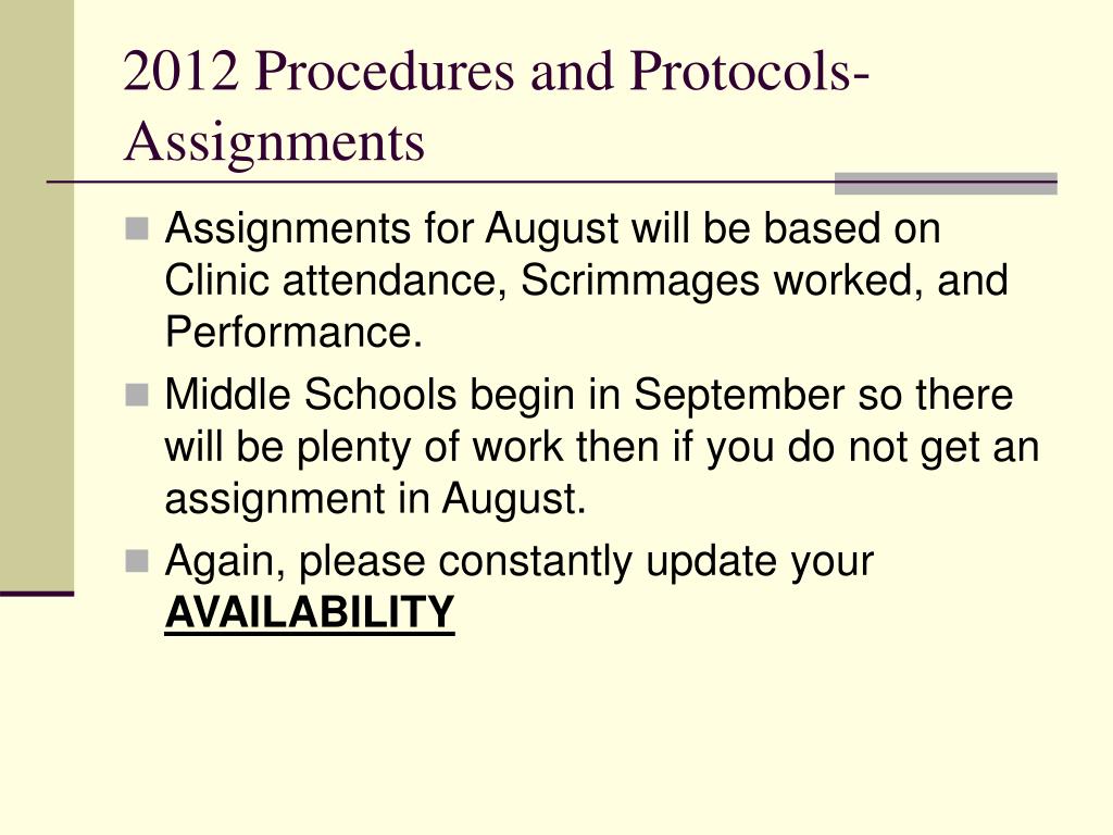 2012 Procedures and Protocols-Assignments • Assignments for August will be based on Clinic attendance, Scrimmages worked, and Performance. • Middle Schools begin in September so there will be plenty of work then if you do not get an assignment in August. • Again, please constantly update your AVAILABILITY
