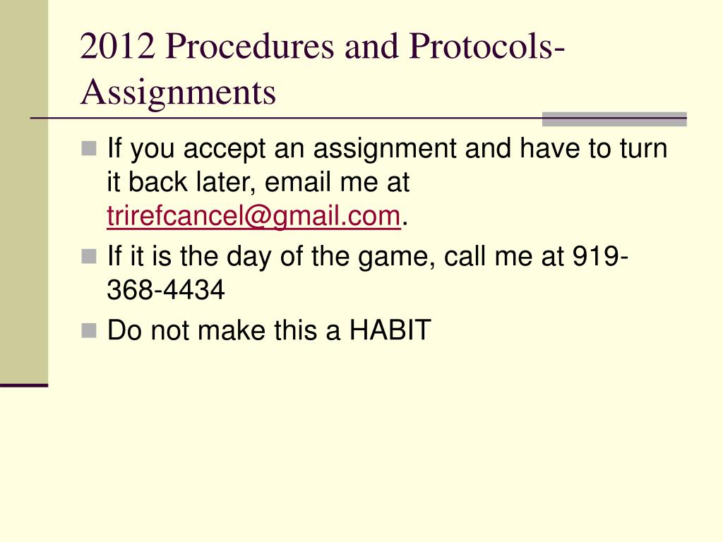 2012 Procedures and Protocols-Assignments • If you accept an assignment and have to turn it back later, email me at trirefcancel@gmail.com. • If it is the day of the game, call me at 919-368-4434 • Do not make this a HABIT