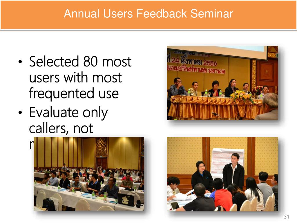 Annual Users Feedback Seminar • Selected 80 most users with most frequented use • Evaluate only callers, not receiver