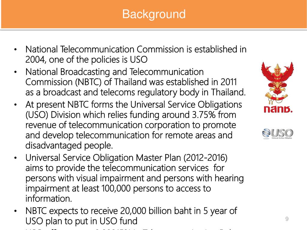 Background • National Telecommunication Commission is established in 2004, one of the policies is USO • National Broadcasting and Telecommunication Commission (NBTC) of Thailand was established in 2011 as a broadcast and telecoms regulatory body in Thailand. • At present NBTC forms the Universal Service Obligations (USO) Division which relies funding around 3.75% from revenue of telecommunication corporation to promote and develop telecommunication for remote areas and disadvantaged people. • Universal Service Obligation Master Plan (2012-2016) aims to provide the telecommunication services for persons with visual impairment and persons with hearing impairment at least 100,000 persons to access to information. • NBTC expects to receive 20,000 billion baht in 5 year of USO plan to put in USO fund • USO office spent 0.00015% in Telecommunication Relay service.