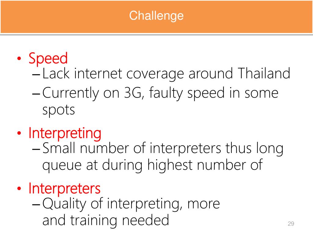 Challenge • Speed • Lack internet coverage around Thailand • Currently on 3G, faulty speed in some spots • Interpreting • Small number of interpreters thus long queue at during highest number of calls • Interpreters • Quality of interpreting, more experience and training needed